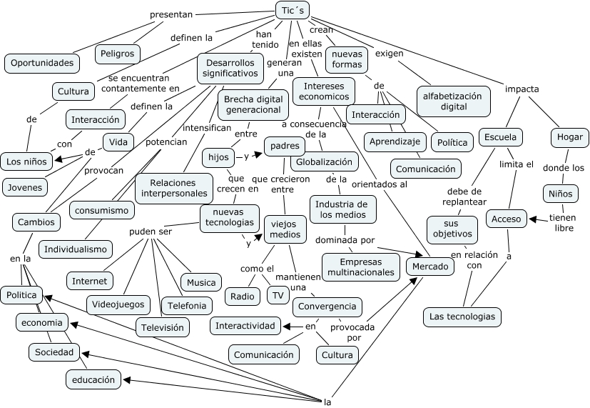 Este Cmap, tiene información relacionada con: 2da. lectura. Tecnologias de la Informacion y la comunicacion, Cultura de Los niños, Tic´s crean nuevas formas, nuevas tecnologias puden ser Musica, Escuela debe de replantear sus objetivos, Tic´s impacta Hogar, Industria de los medios dominada por Empresas multinacionales, Mercado la educación, Tic´s se encuentran contantemente en Interacción, Escuela limita el Acceso, Acceso a Las tecnologias, Desarrollos significativos potencian consumismo, Cambios en la Sociedad, Desarrollos significativos intensifican Relaciones interpersonales, sus objetivos en relación con Las tecnologias, nuevas formas de Comunicación, Vida de Jovenes, Tic´s presentan Oportunidades, Cambios en la economia, Cambios de Jovenes, viejos medios mantienen una Convergencia