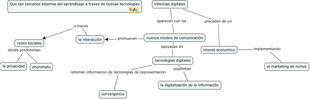 Este Cmap, tiene información relacionada con: infancias digitales, nuevos medios de comunicación promueven la interacción, infancias digitales aparecen con los nuevos medios de comunicación, interes economico implementando el marketing de nichos, nuevos medios de comunicación apoyadas en tecnologias digitales, redes sociales donde predominan la privacidad, tecnologias digitales retoman informacion de tecnologias de representación convergencia, tecnologias digitales posibilitan la digitalización de la información, la interacción a traves redes sociales, redes sociales donde predominan anonimato, infancias digitales preceden de un interes economico