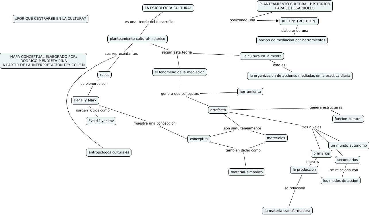 Este Cmap, tiene información relacionada con: COLE M, artefacto son simultaneamente conceptual, planteamiento cultural-historico segun esta teoria el fenomeno de la mediacion, conceptual tambien dicho como materiales, artefacto son simultaneamente materiales, la cultura en la mente esto es la organizacion de acciones mediadas en la practica diaria, el fenomeno de la mediacion genera dos conceptos herramienta, planteamiento cultural-historico sus representantes antropologos culturales, Hegel y Marx muestra una concepcion conceptual, PLANTEAMIENTO CULTURAL-HISTORICO PARA EL DESARROLLO realizando una RECONSTRUCCION, artefacto tres niveles un mundo autonomo, LA PSICOLOGIA CULTURAL es una teoria del desarrollo planteamiento cultural-historico, conceptual tambien dicho como material-simbolico, RECONSTRUCCION elaborando una nocion de mediacion por herramientas, el fenomeno de la mediacion genera dos conceptos artefacto, secundarios se relaciona con los modos de accion, la produccion se relaciona la materia transformadora, planteamiento cultural-historico segun esta teoria la cultura en la mente, artefacto genera estructuras funcion cultural, artefacto tres niveles secundarios, primarios marx w la produccion