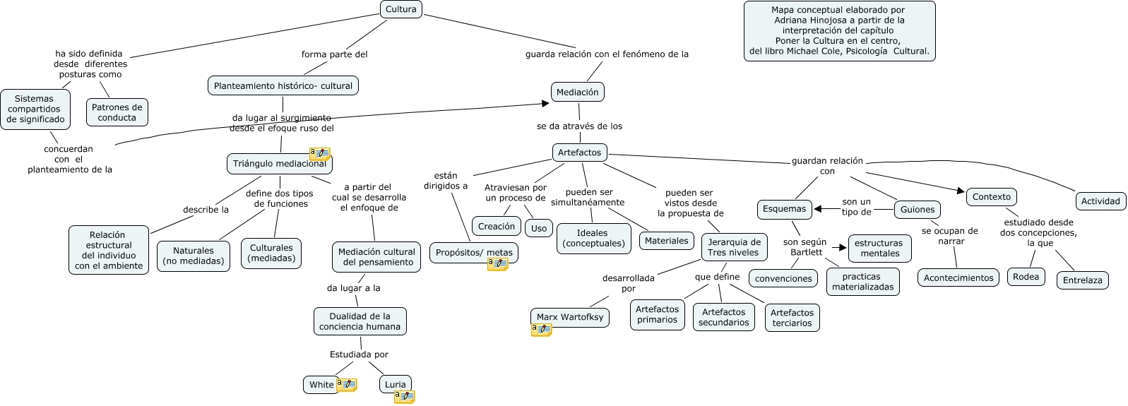 Este Cmap, tiene información relacionada con: Poner la cultura en el centro, Dualidad de la conciencia humana Estudiada por Luria, Artefactos Atraviesan por un proceso de Creación, Cultura ha sido definida desde diferentes posturas como Patrones de conducta, Guiones se ocupan de narrar Acontecimientos, Artefactos guardan relación con Contexto, Cultura ha sido definida desde diferentes posturas como Sistemas compartidos de significado, Guiones son un tipo de Esquemas, Artefactos pueden ser simultanéamente Materiales, Esquemas son según Bartlett practicas materializadas, Artefactos guardan relación con Guiones, Jerarquia de Tres niveles desarrollada por Marx Wartofksy, Triángulo mediacional define dos tipos de funciones Naturales (no mediadas), Artefactos Atraviesan por un proceso de Uso, Artefactos pueden ser vistos desde la propuesta de Jerarquia de Tres niveles, Jerarquia de Tres niveles que define Artefactos secundarios, Artefactos pueden ser simultanéamente Ideales (conceptuales), Sistemas compartidos de significado concuerdan con el planteamiento de la Mediación, Triángulo mediacional describe la Relación estructural del individuo con el ambiente, Dualidad de la conciencia humana Estudiada por White, Planteamiento histórico- cultural da lugar al surgimiento desde el efoque ruso del Triángulo mediacional