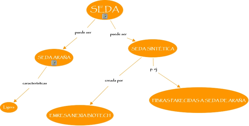 Este Cmap, tiene información relacionada con: Seda, SEDA puede ser SEDA ARAÑA, SEDA puede ser SEDA SINTÉTICA, SEDA SINTÉTICA creada por EMRESA NEXIA BIOTECH, SEDA SINTÉTICA p. ej FIBRAS PARECIDAS A SEDA DE ARAÑA, SEDA ARAÑA caracterísitcas Ligera