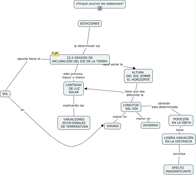 Este Cmap, tiene información relacionada con: las estaciones, SOL en VERANO, 23,5 GRADOS DE INCLINACIÓN DEL EJE DE LA TIERRA apunta hacia el SOL, LONGITUD DEL DÍA también esta determinada POSICIÓN EN LA ÓBITA, ESTACIONES la determinan los 23,5 GRADOS DE INCLINACIÓN DEL EJE DE LA TIERRA, 23,5 GRADOS DE INCLINACIÓN DEL EJE DE LA TIERRA hace variar la ALTURA DEL SOL SOBRE EL HORIZONTE, LONGITUD DEL DÍA mayor en VERANO, LONGITUD DEL DÍA menor en INVIERNO, CANTIDAD DE LUZ SOLAR explicando las VARIACIONES ESTACIONALES DE TEMPERATURA, POSICIÓN EN LA ÓBITA tiene LIGERA VARIACIÓN EN LA DISTANCIA, ALTURA DEL SOL SOBRE EL HORIZONTE hace que sea diferente la CANTIDAD DE LUZ SOLAR, 23,5 GRADOS DE INCLINACIÓN DEL EJE DE LA TIERRA esto provoca mayor o menor CANTIDAD DE LUZ SOLAR, LIGERA VARIACIÓN EN LA DISTANCIA provoca EFECTO INSIGNIFICANTE, ALTURA DEL SOL SOBRE EL HORIZONTE hace que sea diferente la LONGITUD DEL DÍA