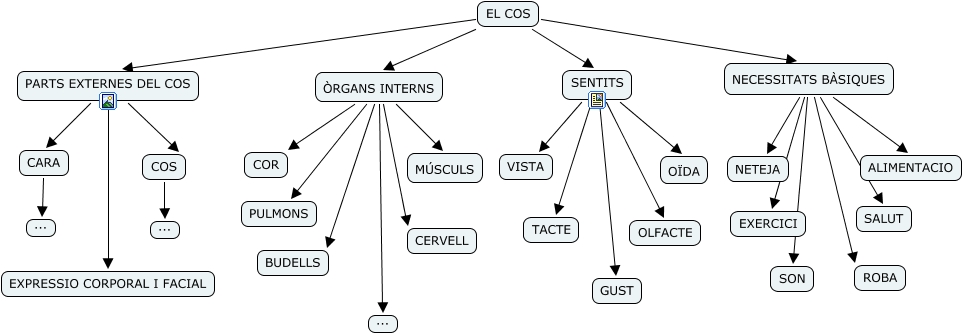 Este Cmap, tiene información relacionada con: EL COS, NECESSITATS BÀSIQUES ROBA, PARTS EXTERNES DEL COS CARA, EL COS PARTS EXTERNES DEL COS, ÒRGANS INTERNS ..., ÒRGANS INTERNS BUDELLS, PARTS EXTERNES DEL COS EXPRESSIO CORPORAL I FACIAL, NECESSITATS BÀSIQUES SON, EL COS SENTITS, SENTITS TACTE, NECESSITATS BÀSIQUES EXERCICI, SENTITS OLFACTE, NECESSITATS BÀSIQUES ALIMENTACIO, ÒRGANS INTERNS COR, ÒRGANS INTERNS MÚSCULS, SENTITS VISTA, PARTS EXTERNES DEL COS COS, COS ..., ÒRGANS INTERNS PULMONS, SENTITS GUST, SENTITS OÏDA