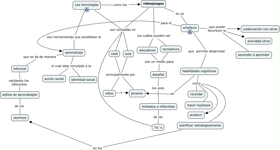 Este Cmap, tiene información relacionada con: Jugar para aprender, educativos son un medio para desafiar, videojuegos los cuáles pueden ser educativos, videojuegos son utilizadas en aula, Las tecnologías son utilizadas en aula, casa principalmente por jóvenes, estilos de aprendizajes de los alumnos, habilidades cognitivas como hacer hipótesis, artefacto que permite desarrollar habilidades cognitivas, Las tecnologías son herramientas que posibilitan el aprendizaje, habilidades cognitivas como recordar, aprendizaje el cual esta vinculado a la acción social, artefacto que puede favorecer la actividad otros, artefacto que puede favorecer la colaboración con otros, videojuegos es un artefacto, habilidades cognitivas como planificar estrategicamente, informal validando los diferentes estilos de aprendizajes, aprendizaje el cual esta vinculado a la identidad social, aula principalmente por niños, artefacto que puede favorecer la aprender a aprender, limitados e inflexibles de las Tic´s