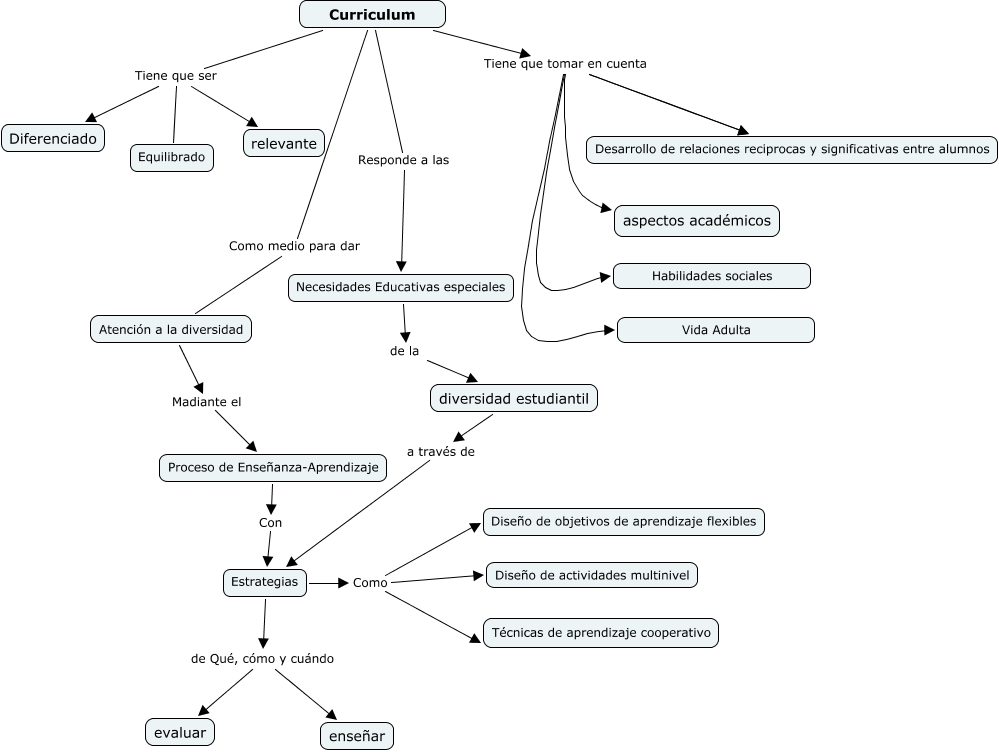 Este Cmap, tiene información relacionada con: Curriculum, Estrategias Como Técnicas de aprendizaje cooperativo, Curriculum Tiene que tomar en cuenta Vida Adulta, Curriculum Tiene que ser relevante, Curriculum Tiene que ser Diferenciado, Curriculum Responde a las Necesidades Educativas especiales, Atención a la diversidad Madiante el Proceso de Enseñanza-Aprendizaje, Proceso de Enseñanza-Aprendizaje Con Estrategias, Necesidades Educativas especiales de la diversidad estudiantil, Estrategias de Qué, cómo y cuándo enseñar, Curriculum Tiene que ser Equilibrado, Estrategias de Qué, cómo y cuándo evaluar, Estrategias Como Diseño de objetivos de aprendizaje flexibles, Curriculum Tiene que tomar en cuenta Desarrollo de relaciones reciprocas y significativas entre alumnos, Estrategias Como Diseño de actividades multinivel, diversidad estudiantil a través de Estrategias, Curriculum Tiene que tomar en cuenta Desarrollo de relaciones reciprocas y significativas entre alumnos, Curriculum Tiene que tomar en cuenta aspectos académicos, Curriculum Tiene que tomar en cuenta Habilidades sociales, Curriculum Como medio para dar Atención a la diversidad