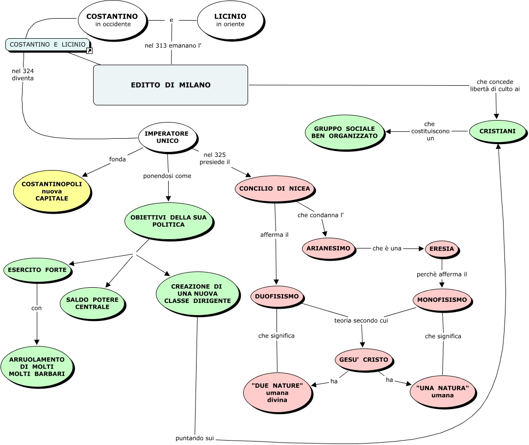 Questa Cmap, creata con IHMC CmapTools, contiene informazioni relative a: costantino, OBIETTIVI DELLA SUA POLITICA ESERCITO FORTE, ESERCITO FORTE con ARRUOLAMENTO DI MOLTI MOLTI BARBARI, GESU' CRISTO ha "DUE NATURE" umana divina, DUOFISISMO teoria secondo cui GESU' CRISTO, MONOFISISMO che significa "UNA NATURA" umana, DUOFISISMO che significa "DUE NATURE" umana divina, ERESIA perchè afferma il MONOFISISMO, GESU' CRISTO ha "UNA NATURA" umana, EDITTO DI MILANO che concede libertà di culto ai CRISTIANI, MONOFISISMO teoria secondo cui GESU' CRISTO, IMPERATORE UNICO nel 325 presiede il CONCILIO DI NICEA, CONCILIO DI NICEA afferma il DUOFISISMO, COSTANTINO in occidente e LICINIO in oriente, COSTANTINO in occidente e LICINIO in oriente, OBIETTIVI DELLA SUA POLITICA SALDO POTERE CENTRALE, CONCILIO DI NICEA che condanna l' ARIANESIMO, OBIETTIVI DELLA SUA POLITICA CREAZIONE DI UNA NUOVA CLASSE DIRIGENTE, CREAZIONE DI UNA NUOVA CLASSE DIRIGENTE puntando sui CRISTIANI, COSTANTINO in occidente nel 324 diventa IMPERATORE UNICO, IMPERATORE UNICO fonda COSTANTINOPOLI nuova CAPITALE