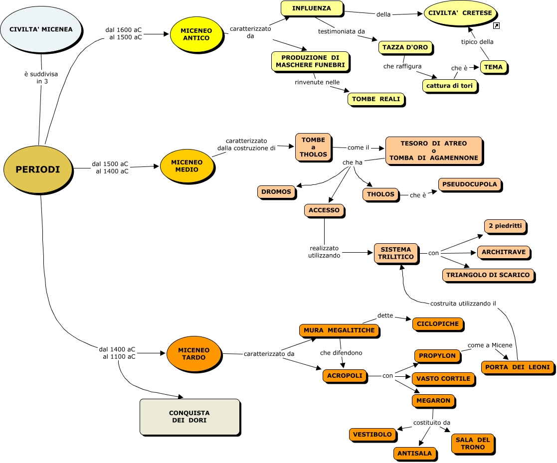 Questa Cmap, creata con IHMC CmapTools, contiene informazioni relative a: civiltà micenea, PERIODI dal 1400 aC al 1100 aC CONQUISTA DEI DORI, MEGARON costituito da ANTISALA, TESORO DI ATREO o TOMBA DI AGAMENNONE che ha ACCESSO, SISTEMA TRILITICO con TRIANGOLO DI SCARICO, MICENEO ANTICO caratterizzato da INFLUENZA, PORTA DEI LEONI costruita utilizzando il SISTEMA TRILITICO, INFLUENZA della CIVILTA' CRETESE, PERIODI dal 1500 aC al 1400 aC MICENEO MEDIO, MICENEO TARDO caratterizzato da ACROPOLI, TOMBE a THOLOS come il TESORO DI ATREO o TOMBA DI AGAMENNONE, MICENEO MEDIO caratterizzato dalla costruzione di TOMBE a THOLOS, SISTEMA TRILITICO con ARCHITRAVE, cattura di tori che è TEMA, CIVILTA' MICENEA è suddivisa in 3 PERIODI, PERIODI dal 1400 aC al 1100 aC MICENEO TARDO, MICENEO TARDO caratterizzato da MURA MEGALITICHE, PERIODI dal 1600 aC al 1500 aC MICENEO ANTICO, ACROPOLI con MEGARON, TAZZA D'ORO che raffigura cattura di tori, PROPYLON come a Micene PORTA DEI LEONI