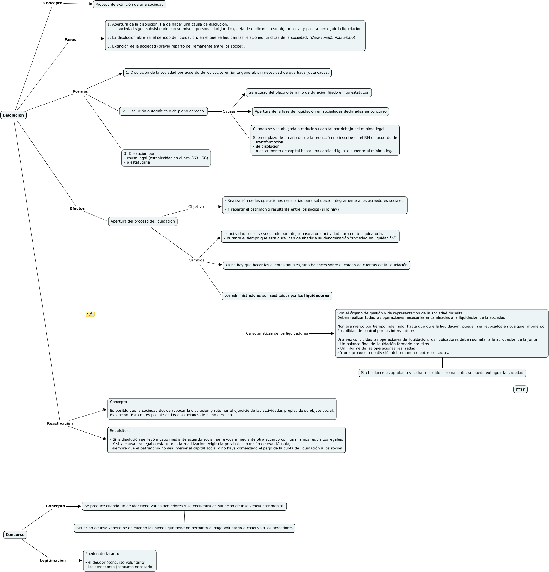 Este Cmap, tiene información relacionada con: Mercantil II - Caso DOCE, Los administradores son sustituidos por los liquidadores Características de los liquidadores Son el órgano de gestión y de representación de la sociedad disuelta. Deben realizar todas las operaciones necesarias encaminadas a la liquidación de la sociedad. Nombramiento por tiempo indefinido, hasta que dure la liquidación; pueden ser revocados en cualquier momento. Posibilidad de control por los interventores Una vez concluidas las operaciones de liquidación, los liquidadores deben someter a la aprobación de la junta: - Un balance final de liquidación formado por ellos - Un informe de las operaciones realizadas - Y una propuesta de división del remanente entre los socios., Concurso Legitimación Pueden declararlo: - el deudor (concurso voluntario) - los acreedores (concurso necesario), Apertura del proceso de liquidación Cambios Los administradores son sustituidos por los liquidadores, Disolución Efectos Apertura del proceso de liquidación, Disolución Fases 1. Apertura de la disolución. Ha de haber una causa de disolución. La sociedad sigue subsistiendo con su misma personalidad jurídica, deja de dedicarse a su objeto social y pasa a perseguir la liquidación. 2. La disolución abre así el período de liquidación, en el que se liquidan las relaciones jurídicas de la sociedad. (desarrollado más abajo) 3. Extinción de la sociedad (previo reparto del remanente entre los socios)., Se produce cuando un deudor tiene varios acreedores y se encuentra en situación de insolvencia patrimonial. ???? Situación de insolvencia: se da cuando los bienes que tiene no permiten el pago voluntario o coactivo a los acreedores, Disolución Formas 1. Disolución de la sociedad por acuerdo de los socios en junta general, sin necesidad de que haya justa causa., 2. Disolución automática o de pleno derecho Causas Cuando se vea obligada a reducir su capital por debajo del mínimo legal Si en el plazo de un año desde la reducción no inscribe en el RM el acuerdo de - transformación - de disolución - o de aumento de capital hasta una cantidad igual o superior al mínimo lega, Apertura del proceso de liquidación Cambios La actividad social se suspende para dejar paso a una actividad puramente liquidatoria. Y durante el tiempo que ésta dura, han de añadir a su denominación “sociedad en liquidación”., Disolución Reactivación Concepto: Es posible que la sociedad decida revocar la disolución y retomar el ejercicio de las actividades propias de su objeto social. Excepción: Esto no es posible en las disoluciones de pleno derecho, Disolución Reactivación Requisitos: - Si la disolución se llevó a cabo mediante acuerdo social, se revocará mediante otro acuerdo con los mismos requisitos legales. - Y si la causa era legal o estatutaria, la reactivación exigirá la previa desaparición de esa cláusula, siempre que el patrimonio no sea inferior al capital social y no haya comenzado el pago de la cuota de liquidación a los socios, Son el órgano de gestión y de representación de la sociedad disuelta. Deben realizar todas las operaciones necesarias encaminadas a la liquidación de la sociedad. Nombramiento por tiempo indefinido, hasta que dure la liquidación; pueden ser revocados en cualquier momento. Posibilidad de control por los interventores Una vez concluidas las operaciones de liquidación, los liquidadores deben someter a la aprobación de la junta: - Un balance final de liquidación formado por ellos - Un informe de las operaciones realizadas - Y una propuesta de división del remanente entre los socios. ???? Si el balance es aprobado y se ha repartido el remanente, se puede extinguir la sociedad, 2. Disolución automática o de pleno derecho Causas Apertura de la fase de liquidación en sociedades declaradas en concurso, Apertura del proceso de liquidación Cambios Ya no hay que hacer las cuentas anuales, sino balances sobre el estado de cuentas de la liquidación, Apertura del proceso de liquidación Objetivo - Realización de las operaciones necesarias para satisfacer íntegramente a los acreedores sociales - Y repartir el patrimonio resultante entre los socios (si lo hay), 2. Disolución automática o de pleno derecho Causas transcurso del plazo o término de duración fijado en los estatutos, Concurso Concepto Se produce cuando un deudor tiene varios acreedores y se encuentra en situación de insolvencia patrimonial., Disolución Concepto Proceso de extinción de una sociedad, Disolución Formas 3. Disolución por - causa legal (establecidas en el art. 363 LSC) - o estatutaria, Disolución Formas 2. Disolución automática o de pleno derecho