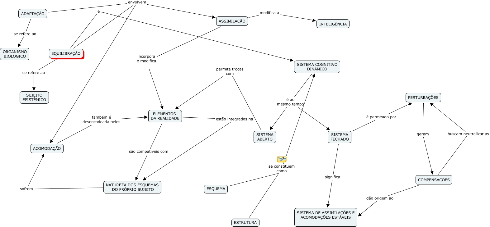 Esse mapa conceitual, produzido no IHMC CmapTools, tem a informação relacionada a: Mapa sobre equilibração - marlusa e rosalia2, SISTEMA FECHADO é permeado por PERTURBAÇÕES, SISTEMA COGNITIVO DINÂMICO é ao mesmo tempo SISTEMA ABERTO, ASSIMILAÇÃO modifica a INTELIGÊNCIA, ELEMENTOS DA REALIDADE estão integrados na NATUREZA DOS ESQUEMAS DO PRÓPRIO SUJEITO, ASSIMILAÇÃO incorpora e modifica ELEMENTOS DA REALIDADE, PERTURBAÇÕES geram COMPENSAÇÕES, SISTEMA ABERTO permite trocas com ELEMENTOS DA REALIDADE, SISTEMA FECHADO significa SISTEMA DE ASSIMILAÇÕES E ACOMODAÇÕES ESTÁVEIS, EQUILIBRAÇÃO envolvem ASSIMILAÇÃO, EQUILIBRAÇÃO se refere ao SUJEITO EPISTÊMICO, ADAPTAÇÃO envolvem ASSIMILAÇÃO, ELEMENTOS DA REALIDADE são compatíveis com NATUREZA DOS ESQUEMAS DO PRÓPRIO SUJEITO, EQUILIBRAÇÃO é SISTEMA COGNITIVO DINÂMICO, ESTRUTURA se constituem como SISTEMA COGNITIVO DINÂMICO, NATUREZA DOS ESQUEMAS DO PRÓPRIO SUJEITO sofrem ACOMODAÇÃO, COMPENSAÇÕES buscam neutralizar as PERTURBAÇÕES, SISTEMA COGNITIVO DINÂMICO é ao mesmo tempo SISTEMA FECHADO, EQUILIBRAÇÃO envolvem ACOMODAÇÃO, ADAPTAÇÃO envolvem ACOMODAÇÃO, ESQUEMA se constituem como SISTEMA COGNITIVO DINÂMICO