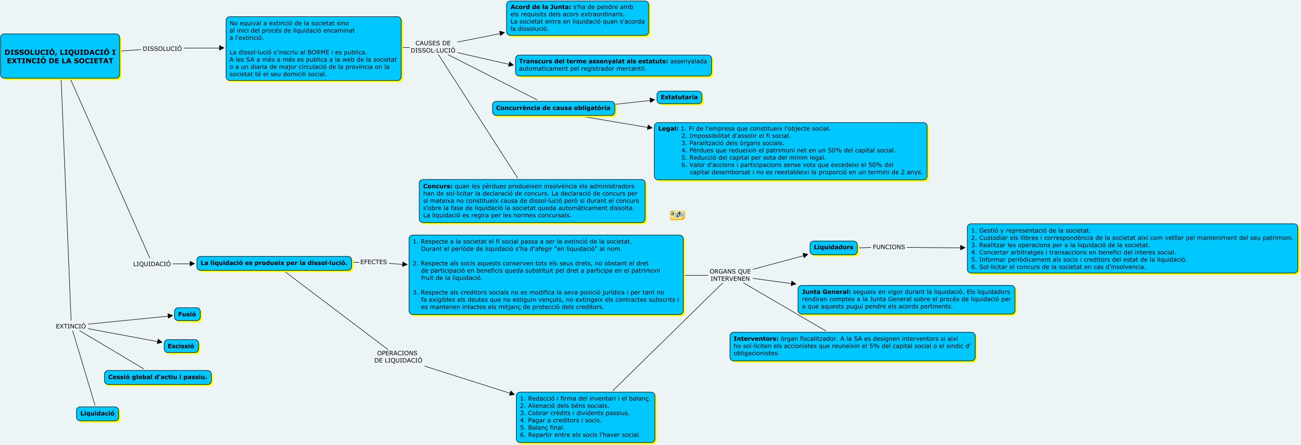 Este Cmap, tiene información relacionada con: ESCENARI 12 MERCANTIL II, No equival a extinció de la societat sino al inici del procés de liquidació encaminat a l'extinció. La dissol·lució s'inscriu al BORME i es publica. A les SA a més a més es publica a la web de la societat o a un diaria de major circulació de la provincia on la societat té el seu domicili social. CAUSES DE DISSOL·LUCIÓ Acord de la Junta: s'ha de pendre amb els requisits dels acors extraordinaris. La societat entra en liquidació quan s'acorda la dissolució., No equival a extinció de la societat sino al inici del procés de liquidació encaminat a l'extinció. La dissol·lució s'inscriu al BORME i es publica. A les SA a més a més es publica a la web de la societat o a un diaria de major circulació de la provincia on la societat té el seu domicili social. CAUSES DE DISSOL·LUCIÓ Concurs: quan les pèrdues produeixen insolvència els administradors han de sol·licitar la declaració de concurs. La declaració de concurs per si mateixa no constitueix causa de dissol·lució però si durant el concurs s'obre la fase de liquidació la societat queda automàticament dissolta. La liquidació es regira per les normes concursals., Liquidadors FUNCIONS 1. Gestió y representació de la societat. 2. Custodiar els llibres i correspondència de la societat així com vetllar pel manteniment del seu patrimoni. 3. Realitzar les operacions per a la liquidació de la societat. 4. Concertar arbitratges i transaccions en benefici del interes social. 5. Informar periòdicament als socis i creditors del estat de la liquidació. 6. Sol·licitar el concurs de la societat en cas d'insolvencia., DISSOLUCIÓ, LIQUIDACIÓ I EXTINCIÓ DE LA SOCIETAT EXTINCIÓ Escissió, 1. Redacció i firma del inventari i el balanç. 2. Alienació dels béns socials. 3. Cobrar crèdits i dividents passius. 4. Pagar a creditors i socis. 5. Balanç final. 6. Repartir entre els socis l'haver social. ORGANS QUE INTERVENEN Liquidadors, Concurrència de causa obligatòria ???? Legal: 1. Fi de l'empresa que constitueix l'objecte social. 2. Impossibilitat d'assolir el fi social. 3. Paralització dels òrgans socials. 4. Pèrdues que redueixin el patrimoni net en un 50% del capital social. 5. Reducció del capital per sota del mínim legal. 6. Valor d'accions i participacions sense vots que excedeixi el 50% del capital desemborsat i no es reestableixi la proporció en un termini de 2 anys., No equival a extinció de la societat sino al inici del procés de liquidació encaminat a l'extinció. La dissol·lució s'inscriu al BORME i es publica. A les SA a més a més es publica a la web de la societat o a un diaria de major circulació de la provincia on la societat té el seu domicili social. CAUSES DE DISSOL·LUCIÓ Concurrència de causa obligatòria, No equival a extinció de la societat sino al inici del procés de liquidació encaminat a l'extinció. La dissol·lució s'inscriu al BORME i es publica. A les SA a més a més es publica a la web de la societat o a un diaria de major circulació de la provincia on la societat té el seu domicili social. CAUSES DE DISSOL·LUCIÓ Transcurs del terme assenyalat als estatuts: assenyalada automaticament pel registrador mercantil., DISSOLUCIÓ, LIQUIDACIÓ I EXTINCIÓ DE LA SOCIETAT LIQUIDACIÓ La liquidació es produeix per la dissol·lució., DISSOLUCIÓ, LIQUIDACIÓ I EXTINCIÓ DE LA SOCIETAT EXTINCIÓ Fusió, 1. Redacció i firma del inventari i el balanç. 2. Alienació dels béns socials. 3. Cobrar crèdits i dividents passius. 4. Pagar a creditors i socis. 5. Balanç final. 6. Repartir entre els socis l'haver social. ORGANS QUE INTERVENEN Junta General: segueix en vigor durant la liquidació. Els liquidadors rendiran comptes a la Junta General sobre el procés de liquidació per a que aquests pugui pendre els acords pertinents., 1. Respecte a la societat el fi social passa a ser la extinció de la societat. Durant el periòde de liquidació s'ha d'afegir "en liquidació" al nom. 2. Respecte als socis aquests conserven tots els seus drets, no obstant el dret de participació en beneficis queda substituit pel dret a participa en el patrimoni fruit de la liquidació. 3. Respecte als creditors socials no es modifica la seva posició jurídica i per tant no fa exigibles els deutes que no estiguin vençuts, no extingeix els contractes subscrits i es mantenen intactes els mitjanç de protecció dels creditors. ORGANS QUE INTERVENEN Junta General: segueix en vigor durant la liquidació. Els liquidadors rendiran comptes a la Junta General sobre el procés de liquidació per a que aquests pugui pendre els acords pertinents., 1. Redacció i firma del inventari i el balanç. 2. Alienació dels béns socials. 3. Cobrar crèdits i dividents passius. 4. Pagar a creditors i socis. 5. Balanç final. 6. Repartir entre els socis l'haver social. ORGANS QUE INTERVENEN Interventors: òrgan fiscalitzador. A la SA es designen interventors si així ho sol·liciten els accionistes que reuneixin el 5% del capital social o el sindic d' obligacionistes., 1. Respecte a la societat el fi social passa a ser la extinció de la societat. Durant el periòde de liquidació s'ha d'afegir "en liquidació" al nom. 2. Respecte als socis aquests conserven tots els seus drets, no obstant el dret de participació en beneficis queda substituit pel dret a participa en el patrimoni fruit de la liquidació. 3. Respecte als creditors socials no es modifica la seva posició jurídica i per tant no fa exigibles els deutes que no estiguin vençuts, no extingeix els contractes subscrits i es mantenen intactes els mitjanç de protecció dels creditors. ORGANS QUE INTERVENEN Interventors: òrgan fiscalitzador. A la SA es designen interventors si així ho sol·liciten els accionistes que reuneixin el 5% del capital social o el sindic d' obligacionistes., Concurrència de causa obligatòria ???? Estatutaria, 1. Respecte a la societat el fi social passa a 