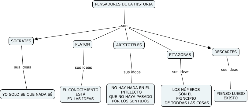 Este Cmap, tiene información relacionada con: PENSANTES, PLATON sus ideas EL CONOCIMIENTO ESTÁ EN LAS IDEAS, DESCARTES sus ideas PIENSO LUEGO EXISTO, PENSADORES DE LA HISTORIA son PLATON, ARISTOTELES sus ideas NO HAY NADA EN EL INTELECTO QUE NO HAYA PASADO POR LOS SENTIDOS, PITAGORAS sus ideas LOS NÚMEROS SON EL PRINCIPIO DE TODDAS LAS C0SAS, PENSADORES DE LA HISTORIA son DESCARTES, PENSADORES DE LA HISTORIA son PITAGORAS, SOCRATES sus ideas YO SOLO SE QUE NADA SÉ, PENSADORES DE LA HISTORIA son SOCRATES, PENSADORES DE LA HISTORIA son ARISTOTELES
