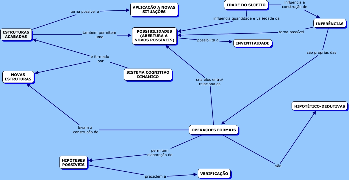 Esse mapa conceitual, produzido no IHMC CmapTools, tem a informação relacionada a: mapa sobre possivel - marlusa e rosalia1.cmap, INFERÊNCIAS torna possível POSSIBILIDADES (ABERTURA A NOVOS POSSÍVEIS), IDADE DO SUJEITO influencia quantidade e variedade da POSSIBILIDADES (ABERTURA A NOVOS POSSÍVEIS), SISTEMA COGNITIVO DINAMICO é formado por NOVAS ESTRUTURAS, OPERAÇÕES FORMAIS são HIPOTÉTICO-DEDUTIVAS, OPERAÇÕES FORMAIS levam à construção de NOVAS ESTRUTURAS, INFERÊNCIAS são próprias das OPERAÇÕES FORMAIS, POSSIBILIDADES (ABERTURA A NOVOS POSSÍVEIS) possibilita a INVENTIVIDADE, IDADE DO SUJEITO influencia a construção de INFERÊNCIAS, ESTRUTURAS ACABADAS torna possível a APLICAÇÃO A NOVAS SITUAÇÕES, OPERAÇÕES FORMAIS permitem elaboração de HIPÓTESES POSSÍVEIS, ESTRUTURAS ACABADAS também permitem uma POSSIBILIDADES (ABERTURA A NOVOS POSSÍVEIS), OPERAÇÕES FORMAIS cria elos entre/ relaciona as POSSIBILIDADES (ABERTURA A NOVOS POSSÍVEIS), SISTEMA COGNITIVO DINAMICO é formado por ESTRUTURAS ACABADAS, HIPÓTESES POSSÍVEIS precedem a VERIFICAÇÃO