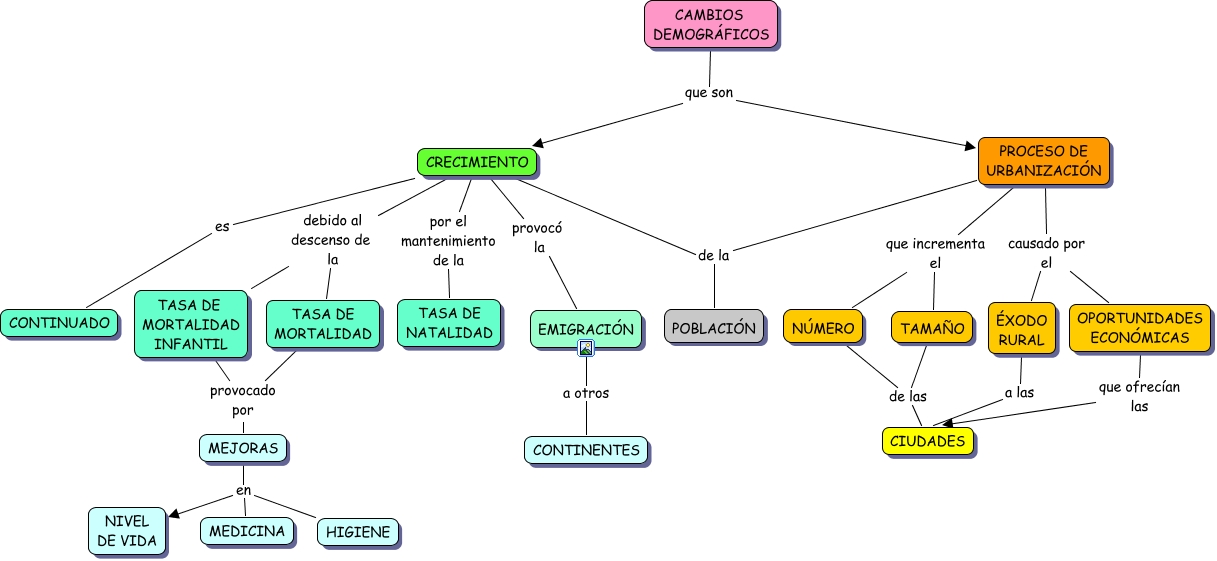 Este Cmap, tiene información relacionada con: CAMBIOS DEMOGRÁFICOS, MEJORAS en HIGIENE, ÉXODO RURAL a las CIUDADES, CRECIMIENTO de la POBLACIÓN, NÚMERO de las CIUDADES, CRECIMIENTO es CONTINUADO, CRECIMIENTO debido al descenso de la TASA DE MORTALIDAD INFANTIL, TAMAÑO de las CIUDADES, PROCESO DE URBANIZACIÓN causado por el ÉXODO RURAL, PROCESO DE URBANIZACIÓN que incrementa el NÚMERO, MEJORAS en NIVEL DE VIDA, CRECIMIENTO provocó la EMIGRACIÓN, PROCESO DE URBANIZACIÓN de la POBLACIÓN, PROCESO DE URBANIZACIÓN causado por el OPORTUNIDADES ECONÓMICAS, TASA DE MORTALIDAD INFANTIL provocado por MEJORAS, OPORTUNIDADES ECONÓMICAS que ofrecían las CIUDADES, PROCESO DE URBANIZACIÓN que incrementa el TAMAÑO, TASA DE MORTALIDAD provocado por MEJORAS, CRECIMIENTO debido al descenso de la TASA DE MORTALIDAD, CAMBIOS DEMOGRÁFICOS que son CRECIMIENTO, EMIGRACIÓN a otros CONTINENTES