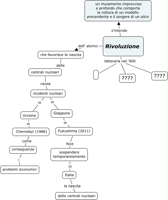 Questa Cmap, creata con IHMC CmapTools, contiene informazioni relative a: Rivoluzione, Chernobyl (1986) come conseguenze, Giappone in Fukushima (2011), che favorisce la nascita delle centrali nucleari, Rivoluzione dell' atomo che favorisce la nascita, incidenti nucleari in Giappone, incidenti nucleari in Ucraina, Fukushima (2011) fece sospendere temporaneamente, conseguenze i problemi economici, Rivoluzione s'intende un mutamento improvviso e profondo che comporta la rottura di un modello precendente e il sorgere di un altro, Italia la nascita delle centrali nucleari, Rivoluzione letteraria nel '900 ????, Rivoluzione letteraria nel '900 ????, centrali nucleari causa incidenti nucleari, sospendere temporaneamente in Italia, Ucraina in Chernobyl (1986), Rivoluzione letteraria nel '900