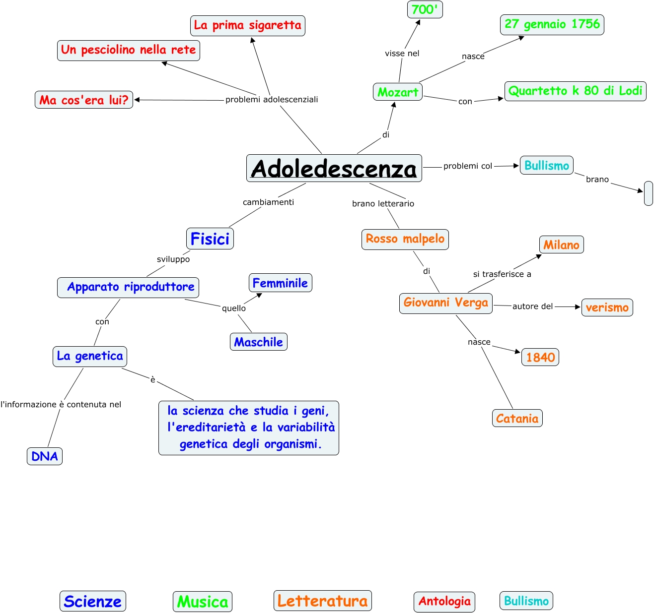 Questa Cmap, creata con IHMC CmapTools, contiene informazioni relative a: Adolescenza, Apparato riproduttore con La genetica, Fisici sviluppo Apparato riproduttore, Adoledescenza cambiamenti Fisici, Rosso malpelo di Giovanni Verga, Apparato riproduttore quello Femminile, Adoledescenza problemi adolescenziali La prima sigaretta, Giovanni Verga autore del verismo, Giovanni Verga nasce Catania, Adoledescenza brano letterario Rosso malpelo, Adoledescenza problemi col Bullismo, Giovanni Verga nasce 1840, Adoledescenza problemi adolescenziali Un pesciolino nella rete, Apparato riproduttore quello Maschile, Adoledescenza problemi adolescenziali Ma cos'era lui?, Mozart visse nel 700', Giovanni Verga si trasferisce a Milano, Mozart nasce 27 gennaio 1756, La genetica l'informazione è contenuta nel DNA, Mozart con Quartetto k 80 di Lodi, Bullismo brano