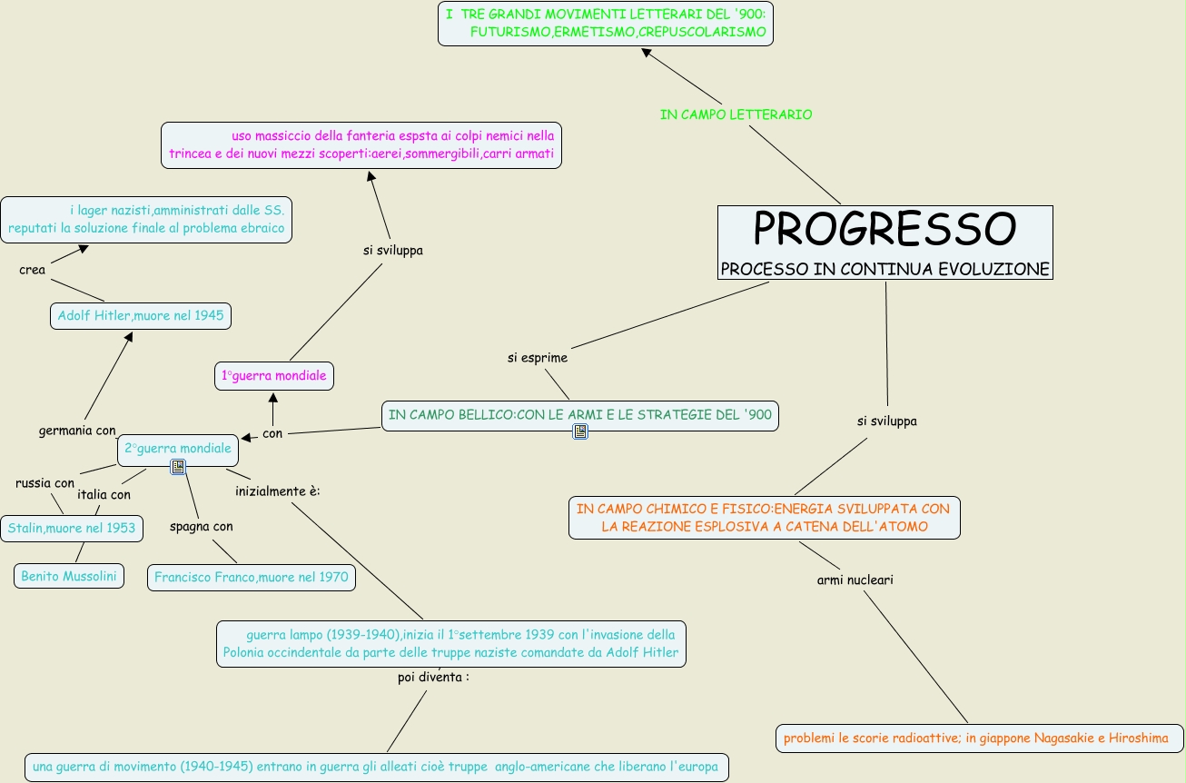 Questa Cmap, creata con IHMC CmapTools, contiene informazioni relative a: mappa progresso, guerra lampo (1939-1940),inizia il 1°settembre 1939 con l'invasione della Polonia occindentale da parte delle truppe naziste comandate da Adolf Hitler poi diventa : una guerra di movimento (1940-1945) entrano in guerra gli alleati cioè truppe anglo-americane che liberano l'europa, 2°guerra mondiale inizialmente è: guerra lampo (1939-1940),inizia il 1°settembre 1939 con l'invasione della Polonia occindentale da parte delle truppe naziste comandate da Adolf Hitler, PROGRESSO PROCESSO IN CONTINUA EVOLUZIONE IN CAMPO LETTERARIO I TRE GRANDI MOVIMENTI LETTERARI DEL '900: FUTURISMO,ERMETISMO,CREPUSCOLARISMO, 1°guerra mondiale si sviluppa uso massiccio della fanteria espsta ai colpi nemici nella trincea e dei nuovi mezzi scoperti:aerei,sommergibili,carri armati, IN CAMPO BELLICO:CON LE ARMI E LE STRATEGIE DEL '900 con 2°guerra mondiale, 2°guerra mondiale italia con Benito Mussolini, 2°guerra mondiale russia con Stalin,muore nel 1953, IN CAMPO CHIMICO E FISICO:ENERGIA SVILUPPATA CON LA REAZIONE ESPLOSIVA A CATENA DELL'ATOMO armi nucleari problemi le scorie radioattive; in giappone Nagasakie e Hiroshima, 2°guerra mondiale spagna con Francisco Franco,muore nel 1970, IN CAMPO BELLICO:CON LE ARMI E LE STRATEGIE DEL '900 con 1°guerra mondiale, PROGRESSO PROCESSO IN CONTINUA EVOLUZIONE si sviluppa IN CAMPO CHIMICO E FISICO:ENERGIA SVILUPPATA CON LA REAZIONE ESPLOSIVA A CATENA DELL'ATOMO, PROGRESSO PROCESSO IN CONTINUA EVOLUZIONE si esprime IN CAMPO BELLICO:CON LE ARMI E LE STRATEGIE DEL '900, 2°guerra mondiale germania con Adolf Hitler,muore nel 1945, Adolf Hitler,muore nel 1945 crea i lager nazisti,amministrati dalle SS. reputati la soluzione finale al problema ebraico