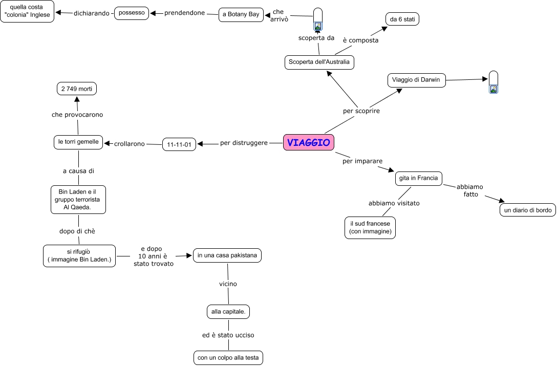Questa Cmap, creata con IHMC CmapTools, contiene informazioni relative a: mappa ele =).cmap VIAGGIO, 11-11-01 crollarono le torri gemelle, in una casa pakistana vicino alla capitale., si rifugiò ( immagine Bin Laden.) e dopo 10 anni è stato trovato in una casa pakistana, che arrivò a Botany Bay, alla capitale. ed è stato ucciso con un colpo alla testa, possesso dichiarando quella costa "colonia" Inglese, gita in Francia abbiamo fatto un diario di bordo, VIAGGIO per scoprire Viaggio di Darwin, a Botany Bay prendendone possesso, Scoperta dell'Australia scoperta da, VIAGGIO per scoprire Scoperta dell'Australia, le torri gemelle a causa di Bin Laden e il gruppo terrorista Al Qaeda., Viaggio di Darwin ????, Bin Laden e il gruppo terrorista Al Qaeda. dopo di chè si rifugiò ( immagine Bin Laden.), Scoperta dell'Australia è composta da 6 stati, VIAGGIO per imparare gita in Francia, gita in Francia abbiamo visitato il sud francese (con immagine), VIAGGIO per distruggere 11-11-01, le torri gemelle che provocarono 2 749 morti