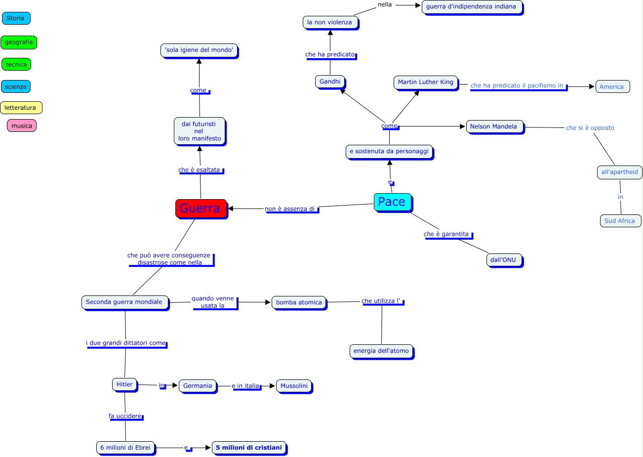 Questa Cmap, creata con IHMC CmapTools, contiene informazioni relative a: Guerra e pace, dai futuristi nel loro manifesto come 'sola igiene del mondo', e sostenuta da personaggi come Nelson Mandela, Hitler fa uccidere 6 milioni di Ebrei, Guerra che è esaltata dai futuristi nel loro manifesto, e sostenuta da personaggi come Martin Luther King, all'apartheid in Sud Africa, e sostenuta da personaggi come Gandhi, bomba atomica che utilizza l' energia dell'atomo, Pace non è assenza di Guerra, Hitler in Germania, 6 milioni di Ebrei e 5 milioni di cristiani, Seconda guerra mondiale quando venne usata la bomba atomica, Nelson Mandela che si è opposto all'apartheid, Pace che è garantita dall'ONU, Germania e in italia Mussolini, Seconda guerra mondiale i due grandi dittatori come Hitler, Guerra che può avere conseguenze disastrose come nella Seconda guerra mondiale, Martin Luther King che ha predicato il pacifismo in America, la non violenza nella guerra d'indipendenza indiana, Gandhi che ha predicato la non violenza