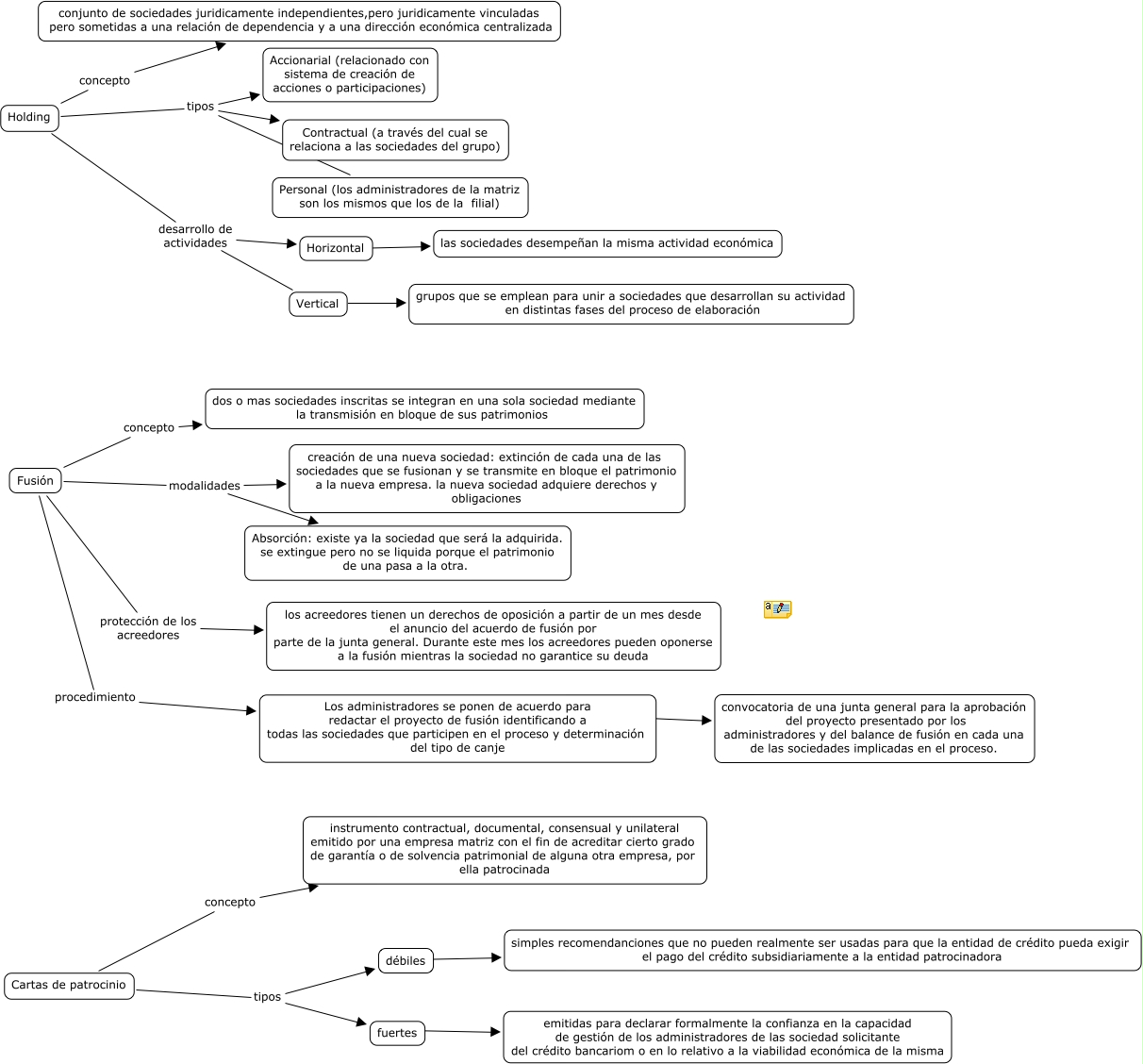 Este Cmap, tiene información relacionada con: salvem els mobles, Fusión modalidades creación de una nueva sociedad: extinción de cada una de las sociedades que se fusionan y se transmite en bloque el patrimonio a la nueva empresa. la nueva sociedad adquiere derechos y obligaciones, Holding desarrollo de actividades Vertical, Holding concepto conjunto de sociedades juridicamente independientes,pero juridicamente vinculadas pero sometidas a una relación de dependencia y a una dirección económica centralizada, Fusión procedimiento Los administradores se ponen de acuerdo para redactar el proyecto de fusión identificando a todas las sociedades que participen en el proceso y determinación del tipo de canje, Horizontal ???? las sociedades desempeñan la misma actividad económica, Los administradores se ponen de acuerdo para redactar el proyecto de fusión identificando a todas las sociedades que participen en el proceso y determinación del tipo de canje es convocatoria de una junta general para la aprobación del proyecto presentado por los administradores y del balance de fusión en cada una de las sociedades implicadas en el proceso., Fusión modalidades Absorción: existe ya la sociedad que será la adquirida. se extingue pero no se liquida porque el patrimonio de una pasa a la otra., fuertes es emitidas para declarar formalmente la confianza en la capacidad de gestión de los administradores de las sociedad solicitante del crédito bancariom o en lo relativo a la viabilidad económica de la misma, Vertical ???? grupos que se emplean para unir a sociedades que desarrollan su actividad en distintas fases del proceso de elaboración, Holding tipos Personal (los administradores de la matriz son los mismos que los de la filial), Fusión concepto dos o mas sociedades inscritas se integran en una sola sociedad mediante la transmisión en bloque de sus patrimonios, Holding tipos Contractual (a través del cual se relaciona a las sociedades del grupo), Fusión protección de los acreedores los acreedores tienen un derechos de oposición a partir de un mes desde el anuncio del acuerdo de fusión por parte de la junta general. Durante este mes los acreedores pueden oponerse a la fusión mientras la sociedad no garantice su deuda, Cartas de patrocinio tipos fuertes, Holding tipos Accionarial (relacionado con sistema de creación de acciones o participaciones), Cartas de patrocinio tipos débiles, débiles es simples recomendanciones que no pueden realmente ser usadas para que la entidad de crédito pueda exigir el pago del crédito subsidiariamente a la entidad patrocinadora, Cartas de patrocinio concepto instrumento contractual, documental, consensual y unilateral emitido por una empresa matriz con el fin de acreditar cierto grado de garantía o de solvencia patrimonial de alguna otra empresa, por ella patrocinada, Holding desarrollo de actividades Horizontal