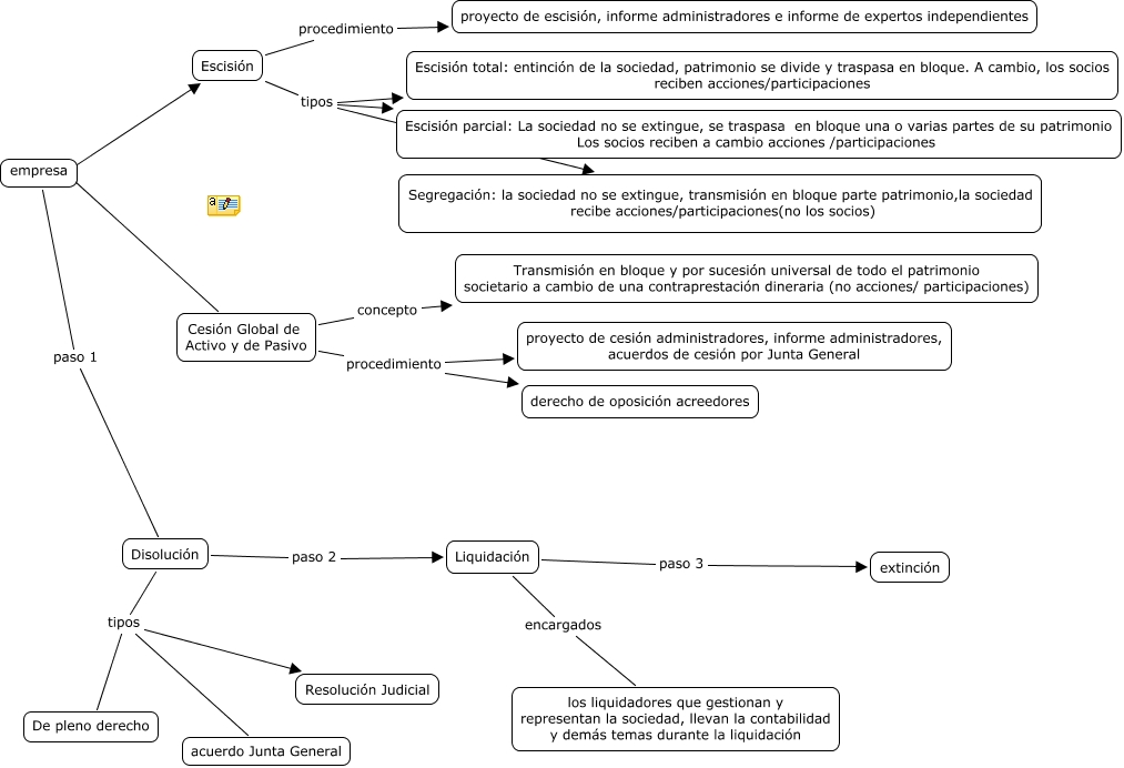 Este Cmap, tiene información relacionada con: escenario 12, mercantil II, empresa es Cesión Global de Activo y de Pasivo, Disolución tipos acuerdo Junta General, Cesión Global de Activo y de Pasivo concepto Transmisión en bloque y por sucesión universal de todo el patrimonio societario a cambio de una contraprestación dineraria (no acciones/ participaciones), Disolución paso 2 Liquidación, Escisión tipos Segregación: la sociedad no se extingue, transmisión en bloque parte patrimonio,la sociedad recibe acciones/participaciones(no los socios), Escisión procedimiento proyecto de escisión, informe administradores e informe de expertos independientes, Escisión tipos Escisión total: entinción de la sociedad, patrimonio se divide y traspasa en bloque. A cambio, los socios reciben acciones/participaciones, Disolución tipos Resolución Judicial, Liquidación paso 3 extinción, Disolución tipos De pleno derecho, empresa es Escisión, Liquidación encargados los liquidadores que gestionan y representan la sociedad, llevan la contabilidad y demás temas durante la liquidación, Cesión Global de Activo y de Pasivo procedimiento proyecto de cesión administradores, informe administradores, acuerdos de cesión por Junta General, Cesión Global de Activo y de Pasivo procedimiento derecho de oposición acreedores, empresa paso 1 Disolución, Escisión tipos Escisión parcial: La sociedad no se extingue, se traspasa en bloque una o varias partes de su patrimonio Los socios reciben a cambio acciones /participaciones
