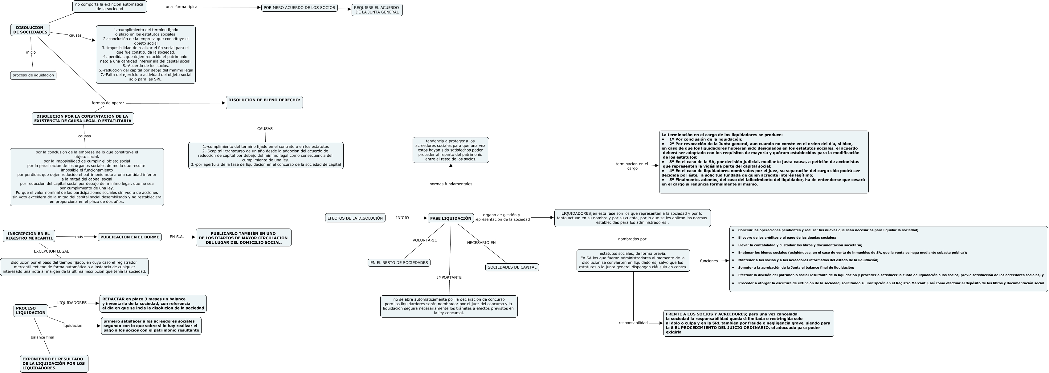 Este Cmap, tiene información relacionada con: ULTIMO CMAPS CASO 12, FASE LIQUIDACIÓN organo de gestión y representacion de la sociedad LIQUIDADORES;en esta fase son los que representan a la sociedad y por lo tanto actuan en su nombre y por su cuenta, por lo que se les aplican las normas establecidas para los administradores ., FASE LIQUIDACIÓN normas fundamentales tendencia a proteger a los acreedores sociales para que una vez estos hayan sido satisfechos poder proceder al reparto del patrimonio entre el resto de los socios., FASE LIQUIDACIÓN VOLUNTARIO EN EL RESTO DE SOCIEDADES, FASE LIQUIDACIÓN NECESARIO EN SOCIEDADES DE CAPITAL, DISOLUCION DE SOCIEDADES ???? no comporta la extincion automatica de la sociedad, DISOLUCION POR LA CONSTATACION DE LA EXISTENCIA DE CAUSA LEGAL O ESTATUTARIA causas por la conclusion de la empresa de lo que constituye el objeto social. por la imposinilidad de cumplir el objeto social por la paralizacion de los órganos sociales de modo que resulte imposible el funcionamiento por perdidas que dejen reducido el patrimonio neto a una cantidad inferior a la mitad del capital social por reduccion del capital social por debajo del mínimo legal, que no sea por cumplimiento de una ley. Porque el valor nominal de las participaciones sociales sin voo o de acciones sin voto exceidera de la mitad del capital social desembilsado y no restableciera en proporciona en el plazo de dos años., no comporta la extincion automatica de la sociedad una forma típica POR MERO ACUERDO DE LOS SOCIOS, estatutos sociales, de forma previa. En SA los que fueran administradores al momento de la disolucion se convierten en liquidadores, salvo que los estatutos o la junta general dispongan cláusula en contra. funciones • Concluir las operaciones pendientes y realizar las nuevas que sean necesarias para liquidar la sociedad; • El cobro de los créditos y el pago de las deudas sociales; • Llevar la contabilidad y custodiar los libros y documentación societaria; • Enajenar los bienes sociales (exigiéndose, en el caso de venta de inmuebles de SA, que la venta se haga mediante subasta pública); • Mantener a los socios y a los acreedores informados del estado de la liquidación; • Someter a la aprobación de la Junta el balance final de liquidación; • Efectuar la división del patrimonio social resultante de la liquidación y proceder a satisfacer la cuota de liquidación a los socios, previa satisfacción de los acreedores sociales; y • Proceder a otorgar la escritura de extinción de la sociedad, solicitando su inscripción en el Registro Mercantil, así como efectuar el depósito de los libros y documentación social., LIQUIDADORES;en esta fase son los que representan a la sociedad y por lo tanto actuan en su nombre y por su cuenta, por lo que se les aplican las normas establecidas para los administradores . nombrados por estatutos sociales, de forma previa. En SA los que fueran administradores al momento de la disolucion se convierten en liquidadores, salvo que los estatutos o la junta general dispongan cláusula en contra., FASE LIQUIDACIÓN IMPORTANTE no se abre automaticamente por la declaracion de concurso pero los liquidardores serán nombrador por el juez del concurso y la liquidacion seguirá necesariamente los trámites a efectos previstos en la ley concursal., PUBLICACION EN EL BORME EN S.A. PUBLICARLO TAMBIÉN EN UNO DE LOS DIARIOS DE MAYOR CIRCULACION DEL LUGAR DEL DOMICILIO SOCIAL., INSCRIPCION EN EL REGISTRO MERCANTIL EXCEPCION LEGAL disolucion por el paso del tiempo fijado, en cuyo caso el registrador mercantil extiene de forma automática o a instancia de cualquier interesado una nota al margen de la última inscripcion que tenía la sociedad., EFECTOS DE LA DISOLUCIÓN INICIO FASE LIQUIDACIÓN, PROCESO LIQUIDACION liquidacion primero satisfacer a los acreedores sociales segundo con lo que sobre si lo hay realizar el pago a los socios con el patrimonio resultante, DISOLUCION DE PLENO DERECHO: CAUSAS 1.-cumplimiento del término fijado en el contrato o en los estatutos 2.-Scapital; transcurso de un año desde la adopcion del acuerdo de reduccion de capital por debajo del minimo legal como consecuencia del cumplimiento de una ley. 3.-por apertura de la fase de liquidación en el concurso de la sociedad de capital, DISOLUCION DE SOCIEDADES causas 1.-cumplimiento del término fijado o plazo en los estatutos sociales. 2.-conclusión de la empresa que constituye el objeto social 3.-imposibilidad de realizar el fin social para el que fue constituida la sociedad. 4.-perdidas que dejen reducido el patrimonio neto a una cantidad inferior ala del capital social. 5.-Acuerdo de los socios. 6.-reduccion del capital por debjo del minimo legal 7.-Falta del ejercicio o actividad del objeto social solo para las SRL., PROCESO LIQUIDACION LIQUIDADORES REDACTAR en plazo 3 meses un balance y inventario de la sociedad, con referencia al día en que se incia la disolucion de la sociedad, DISOLUCION DE SOCIEDADES inicio proceso de iiquidacion, DISOLUCION DE SOCIEDADES formas de operar DISOLUCION DE PLENO DERECHO:, estatutos sociales, de forma previa. En SA los que fueran administradores al momento de la disolucion se convierten en liquidadores, salvo que los estatutos o la junta general dispongan cláusula en contra. responsabilidad FRENTE A LOS SOCIOS Y ACREEDORES; pero una vez cancelada la sociedad la responsabilidad quedará limitada o restringida solo al dolo o culpa y en la SRL también por fraude o negligencia grave, siendo para la S EL PROCEDIMIENTO DEL JUICIO ORDINARIO, el adecuado para poder exigirla