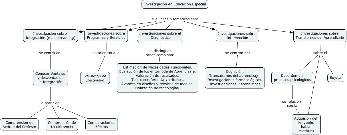Este Cmap, tiene información relacionada con: Investigación en Educación Especial, Investigación en Educación Especial sus líneas o temáticas son: Investigaciones sobre el Diagnóstico, Investigación en Educación Especial sus líneas o temáticas son: Investigación sobre Integración (mainstreaming), Conocer Ventajas y desventas de la Integración a partir de Comprensión de Actitud del Profesor, Investigación en Educación Especial sus líneas o temáticas son: Investigaciones sobre Intervención, Investigación en Educación Especial sus líneas o temáticas son: Investigaciones sobre Programas y Servicios, Investigaciones sobre el Diagnóstico se distinguen áreas como son: Estimación de Necesidades Funcionales. Evalaución de los entornode de Aprendizaje. Valoración de resultados. Test con referencia y criterios. Avances en diseños y técnicas de medida. Utilización de tecnologías., Investigaciones sobre Transtornos del Aprendizaje sobre el Adquisión del lenguaje. habla. escritura, Investigaciones sobre Programas y Servicios se orientan a la Evaluación de Efectividad, Desorden en procesos psicológicos su relación con la Adquisión del lenguaje. habla. escritura, Investigaciones sobre Intervención se centran en: Cognición. Transatornos del aprendizaje. Investigaciones farmacológicas. Investigaciones Pisconalíticas, Investigaciones sobre Transtornos del Aprendizaje sobre el Sujeto, Conocer Ventajas y desventas de la Integración a partir de Comparación de Efectos, Investigaciones sobre Transtornos del Aprendizaje sobre el Desorden en procesos psicológicos, Investigación en Educación Especial sus líneas o temáticas son: Investigaciones sobre Transtornos del Aprendizaje, Investigación sobre Integración (mainstreaming) se centra en: Conocer Ventajas y desventas de la Integración, Conocer Ventajas y desventas de la Integración a partir de Comprensión de La diferencia