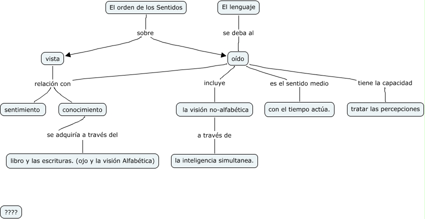This Concept Map, created with IHMC CmapTools, has information related to: capitulo1-El Orden de Los snetidos, conocimiento se adquiría a través del libro y las escrituras. (ojo y la visión Alfabética), vista relación con conocimiento, la visión no-alfabética a través de la inteligencia simultanea., El lenguaje se deba al oído, oído tiene la capacidad tratar las percepciones, oído relación con conocimiento, vista relación con sentimiento, oído incluye la visión no-alfabética, oído relación con sentimiento, oído es el sentido medio con el tiempo actúa., El orden de los Sentidos sobre oído, El orden de los Sentidos sobre vista