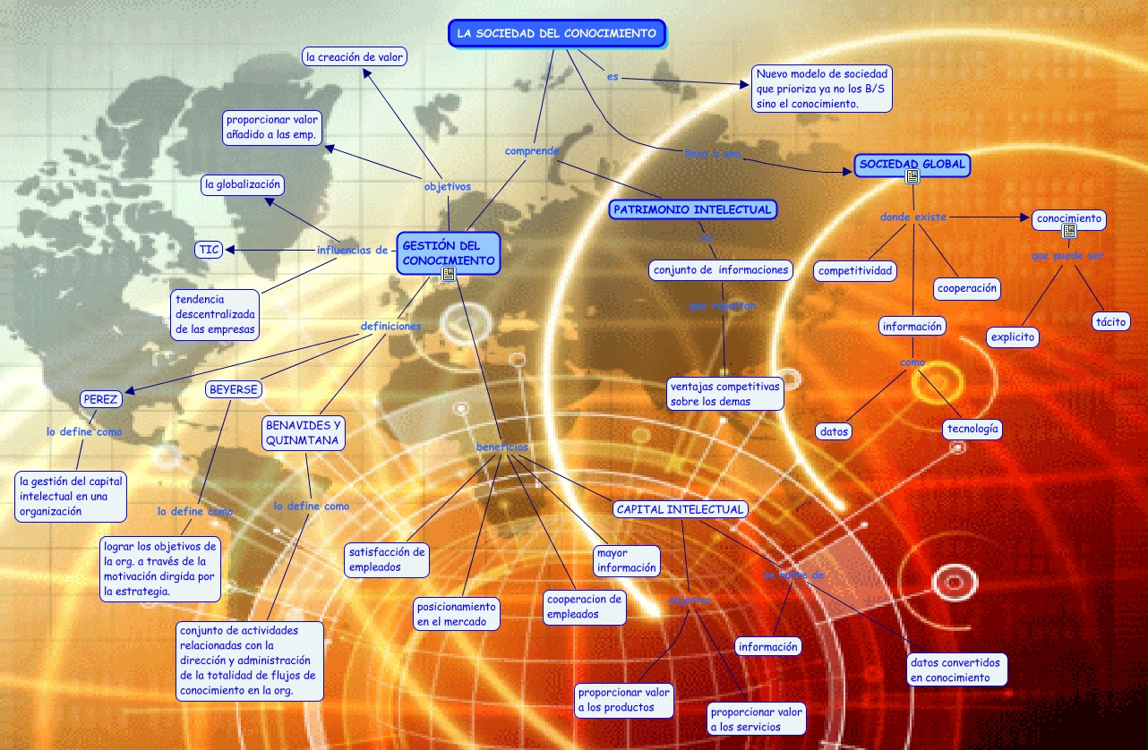 Este Cmap, tiene información relacionada con: MODULO 1, información como tecnología, SOCIEDAD GLOBAL donde existe cooperación, conjunto de informaciones que reportan ventajas competitivas sobre los demas, PEREZ lo define como la gestión del capital intelectual en una organización, GESTIÓN DEL CONOCIMIENTO influencias de TIC, LA SOCIEDAD DEL CONOCIMIENTO comprende PATRIMONIO INTELECTUAL, GESTIÓN DEL CONOCIMIENTO influencias de tendencia descentralizada de las empresas, LA SOCIEDAD DEL CONOCIMIENTO comprende GESTIÓN DEL CONOCIMIENTO, GESTIÓN DEL CONOCIMIENTO beneficios CAPITAL INTELECTUAL, conocimiento que puede ser tácito, SOCIEDAD GLOBAL donde existe información, CAPITAL INTELECTUAL objetivo proporcionar valor a los servicios, CAPITAL INTELECTUAL se nutre de información, PATRIMONIO INTELECTUAL es conjunto de informaciones, BENAVIDES Y QUINMTANA lo define como conjunto de actividades relacionadas con la dirección y administración de la totalidad de flujos de conocimiento en la org., información como datos, GESTIÓN DEL CONOCIMIENTO influencias de la globalización, SOCIEDAD GLOBAL donde existe conocimiento, SOCIEDAD GLOBAL donde existe competitividad, GESTIÓN DEL CONOCIMIENTO objetivos la creación de valor