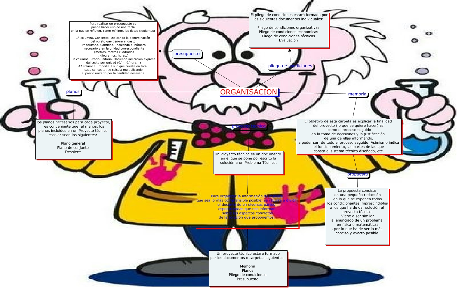Este Cmap, tiene información relacionada con: victor_jonathan-15, ORGANISACION Para realizar un presupuesto se puede hacer uso de una tabla en la que se reflejen, como mínimo, los datos siguientes: 1ª columna. Concepto. Indicando la denominación del objeto que genera el gasto 2ª columna. Cantidad. Indicando el número necesario y en la unidad correspondiente (metros, metros cuadrados , kilogramos, horas.) 3ª columna. Precio unitario. Haciendo indicación expresa del costo por unidad (€/m, €/hora...) 4ª columna. Importe. Es lo que cuesta en total cada concepto; se calcula multiplicando el precio unitario por la cantidad necesaria., ORGANISACION memoria El objetivo de esta carpeta es explicar la finalidad del proyecto (lo que se quiere hacer) así como el proceso seguido en la toma de decisiones y la justificación de una de ellas informando, a poder ser, de todo el proceso seguido. Asimismo indica el funcionamiento, las partes de las que consta el sistema técnico diseñado, etc., El objetivo de esta carpeta es explicar la finalidad del proyecto (lo que se quiere hacer) así como el proceso seguido en la toma de decisiones y la justificación de una de ellas informando, a poder ser, de todo el proceso seguido. Asimismo indica el funcionamiento, las partes de las que consta el sistema técnico diseñado, etc. propuesta La propuesta consiste en una pequeña redacción en la que se exponen todos los condicionantes imprescindibles a los que ha de dar solución el proyecto técnico. Viene a ser similar al enunciado de un problema en física o matemáticas , por lo que ha de ser lo más conciso y exacto posible., ORGANISACION pliego de condiciones El pliego de condiciones estará formado por los siguientes documentos individuales: Pliego de condiciones organizativas Pliego de condiciones económicas Pliego de condiciones técnicas Evaluación, ORGANISACION planos los planos necesarios para cada proyecto, es conveniente que, al menos, los planos incluidos en un Proyecto técnico escolar sean los siguientes: Plano general Plano de conjunto Despiece, ORGANISACION proyecto tecnico Un Proyecto técnico es un documento en el que se pone por escrito la solución a un Problema Técnico., Un Proyecto técnico es un documento en el que se pone por escrito la solución a un Problema Técnico. Para organizar la información de manera que sea lo más comprensible posible, se recurre a dividir el documento en diversas partes especializadas que nos informan sobre los aspectos concretos de la solución que proponemos. Un proyecto técnico estará formado por los documentos o carpetas siguientes: Memoria Planos Pliego de condiciones Presupuesto
