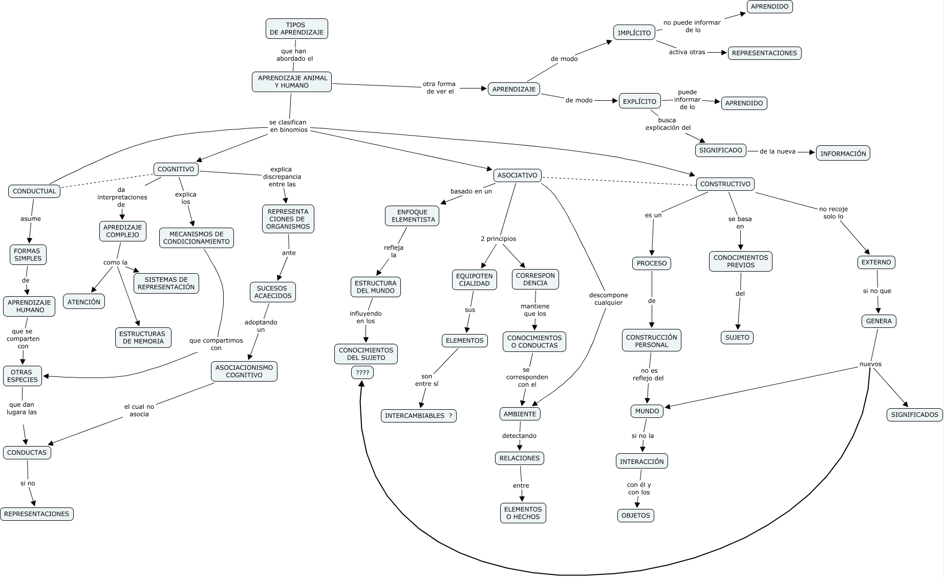 Este Cmap, tiene información relacionada con: CUADRO POZO, GENERA nuevos MUNDO, APRENDIZAJE de modo IMPLÍCITO, ASOCIATIVO descompone cualquier AMBIENTE, GENERA nuevos SIGNIFICADOS, ASOCIATIVO 2 principios EQUIPOTEN CIALIDAD, GENERA nuevos ????, IMPLÍCITO no puede informar de lo APRENDIDO, COGNITIVO da interpretaciones de APREDIZAJE COMPLEJO, CONDUCTUAL ???? COGNITIVO, RELACIONES entre ELEMENTOS O HECHOS, CONOCIMIENTOS PREVIOS del SUJETO, SIGNIFICADO de la nueva INFORMACIÓN, CONDUCTAS si no REPRESENTACIONES, OTRAS ESPECIES que dan lugara las CONDUCTAS, TIPOS DE APRENDIZAJE que han abordado el APRENDIZAJE ANIMAL Y HUMANO, ASOCIACIONISMO COGNITIVO el cual no asocia CONDUCTAS, APRENDIZAJE ANIMAL Y HUMANO se clasifican en binomios COGNITIVO, APRENDIZAJE ANIMAL Y HUMANO se clasifican en binomios ASOCIATIVO, FORMAS SIMPLES de APRENDIZAJE HUMANO, APRENDIZAJE ANIMAL Y HUMANO otra forma de ver el APRENDIZAJE