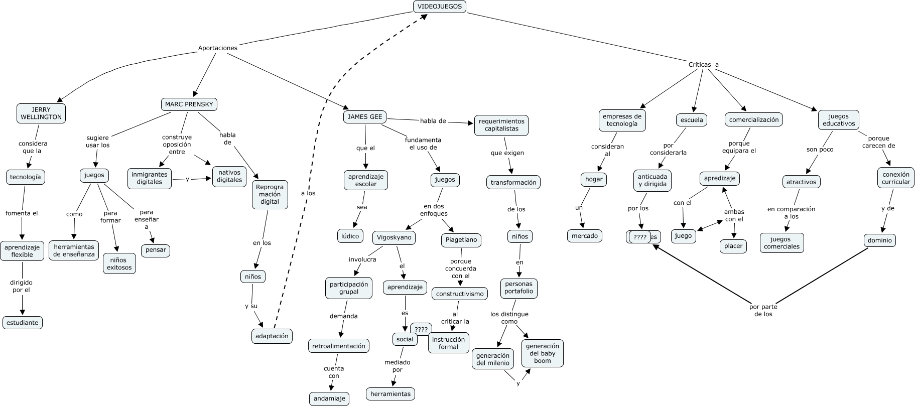 Este Cmap, tiene información relacionada con: LECT 3 JUGAR PARA APRENDER Buckingham, juegos en dos enfoques Piagetiano, VIDEOJUEGOS Aportaciones JAMES GEE, MARC PRENSKY habla de Reprogra mación digital, hogar un mercado, VIDEOJUEGOS Aportaciones MARC PRENSKY, MARC PRENSKY sugiere usar los juegos, JERRY WELLINGTON considera que la tecnología, Vigoskyano involucra participación grupal, tecnología fomenta el aprendizaje flexible, niños en personas portafolio, Vigoskyano el aprendizaje, JAMES GEE habla de requerimientos capitalistas, juegos educativos son poco atractivos, empresas de tecnología consideran al hogar, VIDEOJUEGOS Críticas a comercialización, social mediado por herramientas, anticuada y dirigida por los docentes, atractivos en comparación a los juegos comerciales, aprendizaje es social, Reprogra mación digital en los niños