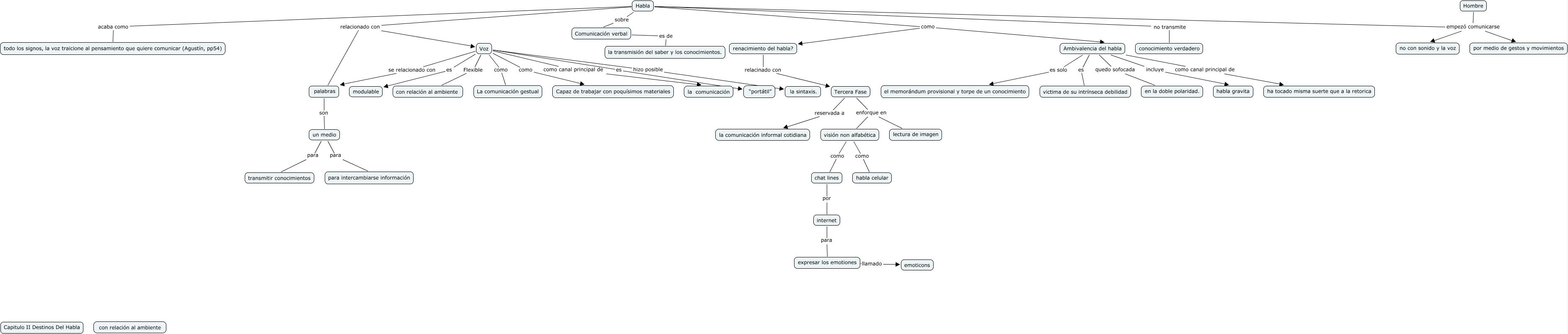 This Concept Map, created with IHMC CmapTools, has information related to: capitulo II-Destinos Del Habla, Hombre empezó comunicarse por medio de gestos y movimientos, chat lines por internet, Habla como Ambivalencia del habla, expresar los emotiones llamado emoticons, Habla empezó comunicarse no con sonido y la voz, Tercera Fase enforque en lectura de imagen, Voz como canal principal de la comunicación, un medio para para intercambiarse información, Habla empezó comunicarse por medio de gestos y movimientos, Comunicación verbal es de la transmisión del saber y los conocimientos., Ambivalencia del habla como canal principal de ha tocado misma suerte que a la retorica, Habla sobre Comunicación verbal, visión non alfabética como habla celular, internet para expresar los emotiones, visión non alfabética como chat lines, Habla no transmite conocimiento verdadero, Habla acaba como todo los signos, la voz traicione al pensamiento que quiere comunicar (Agustín, pp54), Voz es “portátil”, Voz hizo posible la sintaxis., Voz se relacionado con palabras