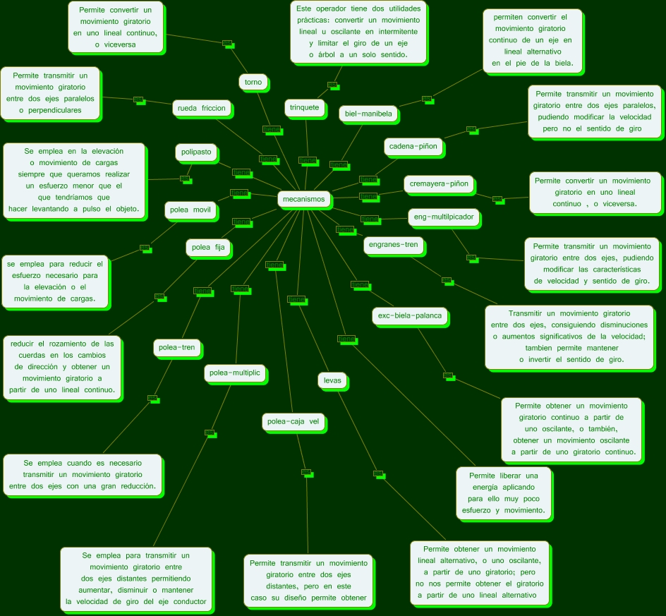 Este Cmap, tiene información relacionada con: sergio y sabinee mecanismos, rueda friccion es Permite transmitir un movimiento giratorio entre dos ejes paralelos o perpendiculares, eng-multilpicador es Permite transmitir un movimiento giratorio entre dos ejes, pudiendo modificar las características de velocidad y sentido de giro., mecanismos tiene Permite liberar una energía aplicando para ello muy poco esfuerzo y movimiento., mecanismos tiene polea-tren, polea-caja vel es Permite transmitir un movimiento giratorio entre dos ejes distantes, pero en este caso su diseño permite obtener, mecanismos tiene polea fija, polipasto es Se emplea en la elevación o movimiento de cargas siempre que queramos realizar un esfuerzo menor que el que tendríamos que hacer levantando a pulso el objeto., trinquete es Este operador tiene dos utilidades prácticas: convertir un movimiento lineal u oscilante en intermitente y limitar el giro de un eje o árbol a un solo sentido., mecanismos tiene exc-biela-palanca, mecanismos tiene biel-manibela, mecanismos tiene cremayera-piñon, mecanismos tiene cadena-piñon, polea fija es reducir el rozamiento de las cuerdas en los cambios de dirección y obtener un movimiento giratorio a partir de uno lineal continuo., mecanismos tiene eng-multilpicador, cremayera-piñon es Permite convertir un movimiento giratorio en uno lineal continuo , o viceversa., mecanismos tiene polea-multiplic, engranes-tren es Transmitir un movimiento giratorio entre dos ejes, consiguiendo disminuciones o aumentos significativos de la velocidad; tambien permite mantener o invertir el sentido de giro., polea-tren es Se emplea cuando es necesario transmitir un movimiento giratorio entre dos ejes con una gran reducción., cadena-piñon es Permite transmitir un movimiento giratorio entre dos ejes paralelos, pudiendo modificar la velocidad pero no el sentido de giro, mecanismos tiene polipasto