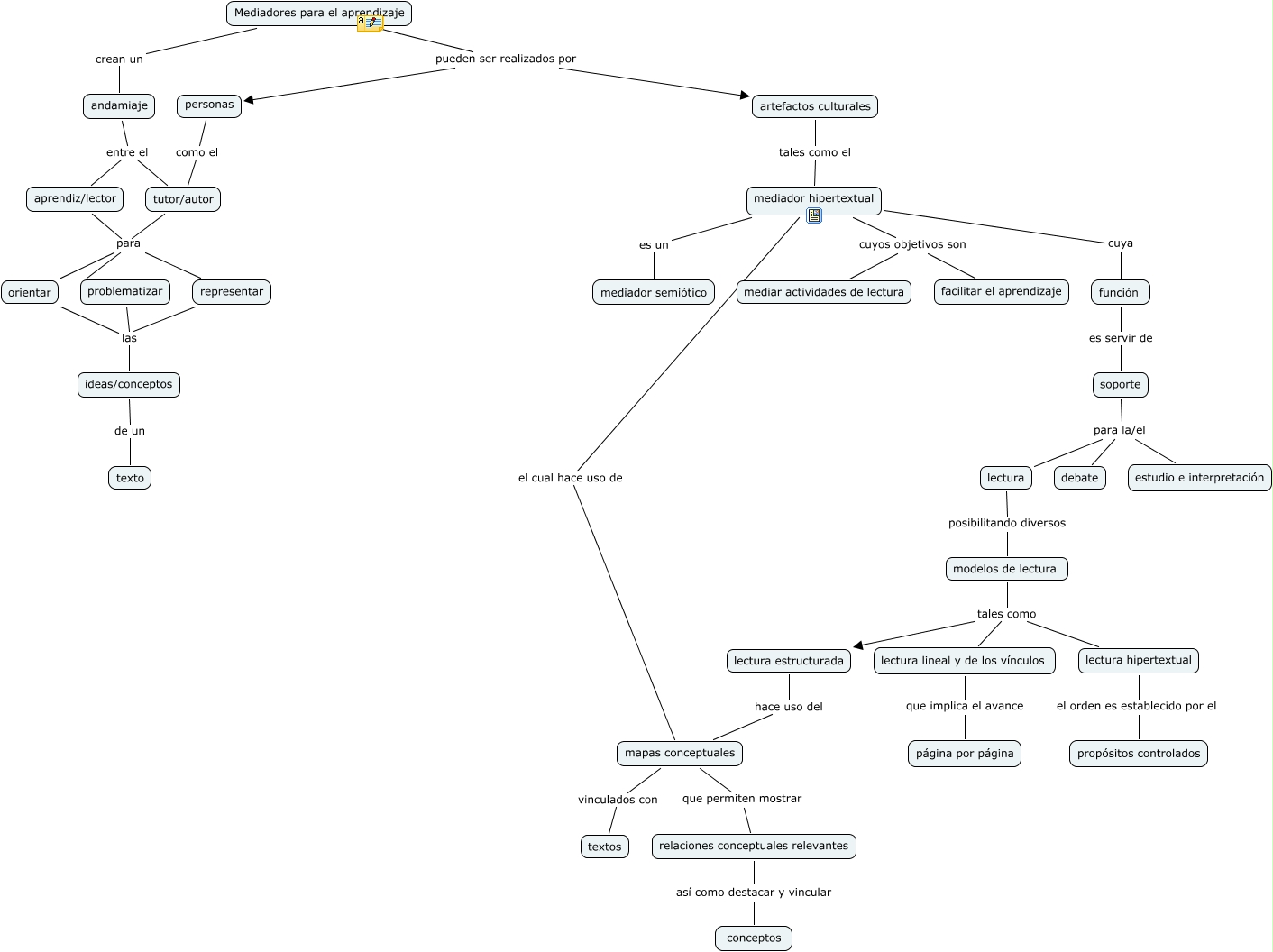 Este Cmap, tiene información relacionada con: Mediador hipertextual, representar las ideas/conceptos, soporte para la/el estudio e interpretación, personas como el tutor/autor, ideas/conceptos de un texto, orientar las ideas/conceptos, función es servir de soporte, tutor/autor para orientar, tutor/autor para problematizar, lectura posibilitando diversos modelos de lectura, mapas conceptuales que permiten mostrar relaciones conceptuales relevantes, mediador hipertextual cuyos objetivos son mediar actividades de lectura, problematizar las ideas/conceptos, lectura estructurada hace uso del mapas conceptuales, relaciones conceptuales relevantes así como destacar y vincular conceptos, modelos de lectura tales como lectura hipertextual, Mediadores para el aprendizaje pueden ser realizados por artefactos culturales, Mediadores para el aprendizaje pueden ser realizados por personas, lectura hipertextual el orden es establecido por el propósitos controlados, andamiaje entre el aprendiz/lector, aprendiz/lector para representar
