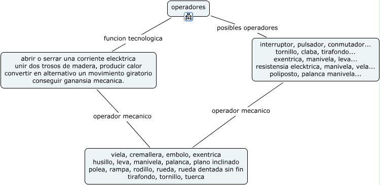Este Cmap, tiene información relacionada con: ROSENDO2, operadores posibles operadores interruptor, pulsador, conmutador... tornillo, claba, tirafondo... exentrica, manivela, leva... resistensia elecktrica, manivela, vela... poliposto, palanca manivela..., operadores funcion tecnologica abrir o serrar una corriente elecktrica unir dos trosos de madera, producir calor convertir en alternativo un movimiento giratorio conseguir ganansia mecanica., interruptor, pulsador, conmutador... tornillo, claba, tirafondo... exentrica, manivela, leva... resistensia elecktrica, manivela, vela... poliposto, palanca manivela... operador mecanico viela, cremallera, embolo, exentrica husillo, leva, manivela, palanca, plano inclinado polea, rampa, rodillo, rueda, rueda dentada sin fin tirafondo, tornillo, tuerca, abrir o serrar una corriente elecktrica unir dos trosos de madera, producir calor convertir en alternativo un movimiento giratorio conseguir ganansia mecanica. operador mecanico viela, cremallera, embolo, exentrica husillo, leva, manivela, palanca, plano inclinado polea, rampa, rodillo, rueda, rueda dentada sin fin tirafondo, tornillo, tuerca