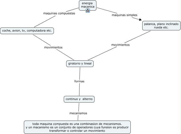 Este Cmap, tiene información relacionada con: ROSENDO, continuo y alterno mecanismos toda maquina compuesta es una combinasion de mecanismos. y un macanismo es un conjunto de operadores cuya funsion es producir transformar o controlar un movimiento, giratorio y lineal formas continuo y alterno, palanca, plano inclinado rueda etc. movimientos giratorio y lineal, coche, avion, tv, computadora etc. movimientos giratorio y lineal, energia macanica maquinas simples palanca, plano inclinado rueda etc., energia macanica maquinas compuestas coche, avion, tv, computadora etc.
