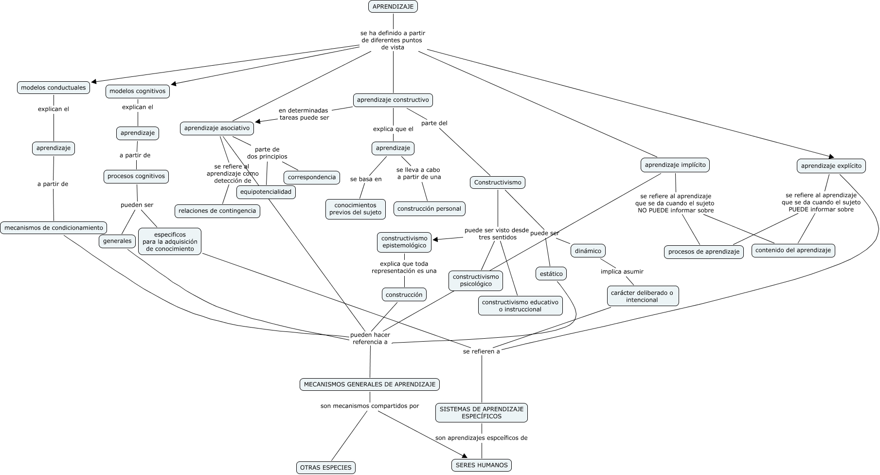 Este Cmap, tiene información relacionada con: Cuando nada de lo animal nos es ajeno, aprendizaje se lleva a cabo a partir de una construcción personal, aprendizaje constructivo parte del Constructivismo, aprendizaje implícito se refiere al aprendizaje que se da cuando el sujeto NO PUEDE informar sobre procesos de aprendizaje, Constructivismo puede ser visto desde tres sentidos constructivismo psicológico, aprendizaje implícito se refiere al aprendizaje que se da cuando el sujeto NO PUEDE informar sobre contenido del aprendizaje, mecanismos de condicionamiento pueden hacer referencia a MECANISMOS GENERALES DE APRENDIZAJE, aprendizaje asociativo parte de dos principios equipotencialidad, aprendizaje a partir de mecanismos de condicionamiento, estático pueden hacer referencia a MECANISMOS GENERALES DE APRENDIZAJE, carácter deliberado o intencional se refieren a SISTEMAS DE APRENDIZAJE ESPECÍFICOS, APRENDIZAJE se ha definido a partir de diferentes puntos de vista modelos conductuales, aprendizaje asociativo pueden hacer referencia a MECANISMOS GENERALES DE APRENDIZAJE, aprendizaje constructivo explica que el aprendizaje, APRENDIZAJE se ha definido a partir de diferentes puntos de vista aprendizaje implícito, APRENDIZAJE se ha definido a partir de diferentes puntos de vista aprendizaje constructivo, aprendizaje asociativo se refiere al aprendizaje como detección de relaciones de contingencia, Constructivismo puede ser visto desde tres sentidos constructivismo educativo o instruccional, Constructivismo puede ser dinámico, aprendizaje explícito se refieren a SISTEMAS DE APRENDIZAJE ESPECÍFICOS, generales pueden hacer referencia a MECANISMOS GENERALES DE APRENDIZAJE