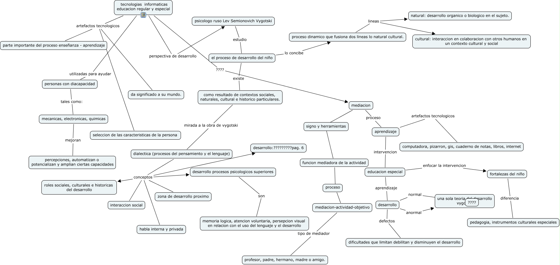 Este Cmap, tiene información relacionada con: TECNOLOGIA Y EDUCACION ESPECIAL2, proceso dinamico que fusiona dos lineas lo natural cultural. lineas natural: desarrollo organico o biologico en el sujeto., funcion mediadora de la actividad mediacion-actividad-objetivo, dialectica (procesos del pensamiento y el lenguaje) conceptos desarrollo procesos psicologicos superiores, psicologo ruso Lev Semionovich Vygotski estudio el proceso de desarrollo del niño, mediacion funcion mediadora de la actividad, dialectica (procesos del pensamiento y el lenguaje) conceptos roles sociales, culturales e historicas del desarrollo, desarrollo normal ????, tecnologias informaticas educacion regular y especial artefactos tecnologicos da significado a su mundo., tecnologias informaticas educacion regular y especial ???? mediacion, mecanicas, electronicas, quimicas mejoran percepciones, automatizan o potencializan y amplian ciertas capacidades, aprendizaje artefactos tecnologicos computadora, pizarron, gis, cuaderno de notas, libros, internet, desarrollo anormal una sola teoria del desarrollo vygotski, desarrollo defectos dificultades que limitan debilitan y disminuyen el desarrollo, tecnologias informaticas educacion regular y especial utilizadas para ayudar personas con diacapacidad, el proceso de desarrollo del niño lo concibe proceso dinamico que fusiona dos lineas lo natural cultural., tecnologias informaticas educacion regular y especial perspectiva de desarrollo psicologo ruso Lev Semionovich Vygotski, dialectica (procesos del pensamiento y el lenguaje) conceptos habla interna y privada, personas con diacapacidad tales como: mecanicas, electronicas, quimicas, dialectica (procesos del pensamiento y el lenguaje) conceptos interaccion social, mediacion-actividad-objetivo tipo de mediador profesor, padre, hermano, madre o amigo.