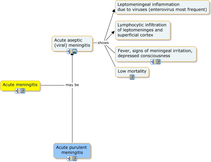 This Concept Map, created with IHMC CmapTools, has information related to: Acute meningitis, infants & children Haemophilus influenzae, adolescents & young adults Neisseria meningitidis, Acute aseptic (viral) meningitis shows Low mortality, neonates group B streptoccocci Escherichia coli, Purulent leptomeningeal inflammation due to bacteria in infants & children, elderly Streptococcus pneumoniae, Listeria monocytogenes, Acute purulent meningitis shows Purulent leptomeningeal inflammation due to bacteria, Acute purulent meningitis shows Neutrophilic infiltration of the leptomeninges extending variably to cortex, Acute purulent meningitis shows Headache, fever, nuchal rigidity, cloudy sensorium, coma, and death, Acute aseptic (viral) meningitis shows Fever, signs of meningeal irritation, depressed consciousness, Acute aseptic (viral) meningitis shows Leptomeningeal inflammation due to viruses (enterovirus most frequent), Purulent leptomeningeal inflammation due to bacteria in adolescents & young adults, Acute purulent meningitis shows Diffuse cerebral edema: risk of fatal herniations, Acute purulent meningitis shows Sequelae due to organization of purulent exudate and fibrosis, Purulent leptomeningeal inflammation due to bacteria in neonates, Sequelae due to organization of purulent exudate and fibrosis as Cranial nerve impairment (neural deafness), Sequelae due to organization of purulent exudate and fibrosis as hydrocephalus, Acute meningitis may be Acute aseptic (viral) meningitis, Acute meningitis may be Acute purulent meningitis, Acute aseptic (viral) meningitis shows Lymphocytic infiltration of leptomeninges and superficial cortex