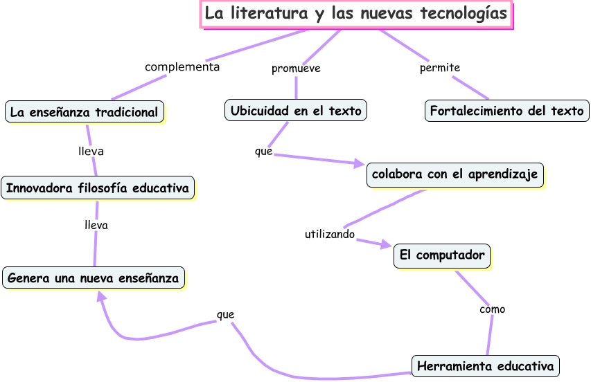 Este Cmap, tiene información relacionada con: clase 1, colabora con el aprendizaje utilizando El computador, La literatura y las nuevas tecnologías permite Fortalecimiento del texto, Ubicuidad en el texto que colabora con el aprendizaje, La literatura y las nuevas tecnologías promueve Ubicuidad en el texto, Innovadora filosofía educativa lleva Genera una nueva enseñanza, La enseñanza tradicional lleva Innovadora filosofía educativa, La literatura y las nuevas tecnologías promueve Ubicuidad en el texto, La literatura y las nuevas tecnologías complementa La enseñanza tradicional, Herramienta educativa que Genera una nueva enseñanza, El computador como Herramienta educativa