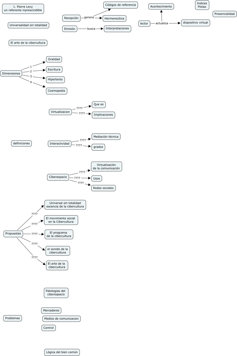 Este Cmap, tiene información relacionada con: Pierre Levy un referente imprescindible, Interactividad ???? Mediación técnica, Propuestas ???? El programa de la cibercultura, Dimensiones 3 Hipertexto, Ciberespacio ???? Virtualización de la comunicación, Dimensiones 4 Cosmopedia, lector actualiza dispositivo virtual, Propuestas ???? el sonido de la cibercultura, Virtualizacion ???? Implicaciones, lector actualiza Acontecimiento, Ciberespacio ???? Usos, Virtualizacion ???? Que es, Interactividad ???? grados, Dimensiones 2 Escritura, Recepción genera Hermeneútica, Propuestas ???? El movimiento social en la Cibercultura, Ciberespacio ???? Redes sociales, Dimensiones 1 Oralidad, Emisión busca Interpretaciones, Propuestas ???? Universal sin totalidad escencia de la cibercultura, Recepción genera Códigos de referencia