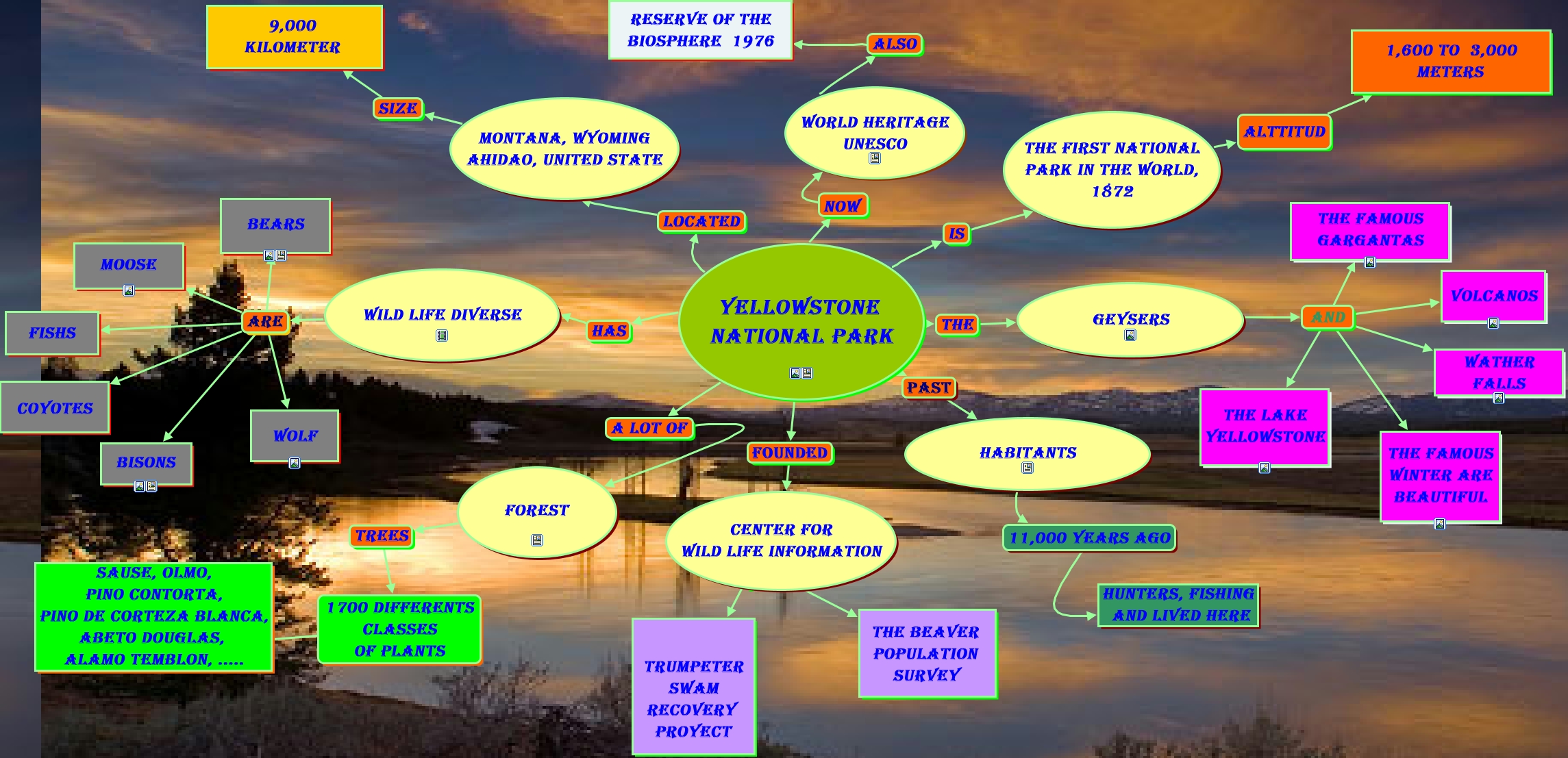 Este Cmap, tiene información relacionada con: NATIONAL PARK YELLOWSTONE, WILD LIFE DIVERSE ARE WOLF, WORLD HERITAGE UNESCO also RESERVE OF THE BIOSPHERE 1976, THE FIRST NATIONAL PARK IN THE WORLD, 1872 alttitud 1,600 to 3,000 meters, FOREST trees 1700 DIFFERENTS CLASSES OF PLANTS, GEYSERS and THE LAKE YELLOWSTONE, WILD LIFE DIVERSE ARE moose, YELLOWSTONE NATIONAL PARK has WILD LIFE DIVERSE, MONTANA, WYOMING AHIDAO, UNiTED STATE size 9,000 kilometer, GEYSERS and WATHER FALLS, center for wild life information ???? THE BEAVER POPULATION SURVEY, YELLOWSTONE NATIONAL PARK a lot of FOREST, YELLOWSTONE NATIONAL PARK now WORLD HERITAGE UNESCO, YELLOWSTONE NATIONAL PARK founded center for wild life information, WILD LIFE DIVERSE ARE BEARS, WILD LIFE DIVERSE ARE FISHS, WILD LIFE DIVERSE ARE coyotes, WILD LIFE DIVERSE ARE BISONS, YELLOWSTONE NATIONAL PARK located MONTANA, WYOMING AHIDAO, UNiTED STATE, YELLOWSTONE NATIONAL PARK the GEYSERS, center for wild life information trumpeter swam recovery proyect