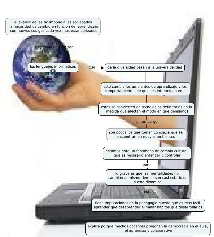 Este Cmap, tiene información relacionada con: Sin Título 3, los lenguajes informaticos que de la diversidad pasan a la universidalidad, estamos ante un fenomeno de cambio cultural que es necesario entender y controlar pero lo grave es que las mentalidades no cambian al mismo tiempo son casi estaticas a esta dinamica, lo grave es que las mentalidades no cambian al mismo tiempo son casi estaticas a esta dinamica esto tiene implicaciones en la pedagogia puesto que es mas facil aprender que desaprender eliminar habitos que desarrollarlos, tiene implicaciones en la pedagogia puesto que es mas facil aprender que desaprender eliminar habitos que desarrollarlos lo cual explica porque muchos docentes pregonan la democracia en el aula, el aprendizaje colaborativo, de la diversidad pasan a la universidalidad ???? esto cambia los ambientes de aprendizaje y los comportamientos de quienes interactuan en el, esto cambia los ambientes de aprendizaje y los comportamientos de quienes interactuan en el ???? estas se convierten en tecnologias definitorias en la medida que afectan el modo en que pensamos, el avance de las tic impone a las sociedades la necesidad de cambio en funcion del aprendizaje con nuevos codigos cada vez mas estandarizados un ejemplo de esto son los lenguajes informaticos, estas se convierten en tecnologias definitorias en la medida que afectan el modo en que pensamos sin embargo son pocos los que toman conciecia que se encuentran en nuevos ambientes, son pocos los que toman conciecia que se encuentran en nuevos ambientes ???? estamos ante un fenomeno de cambio cultural que es necesario entender y controlar