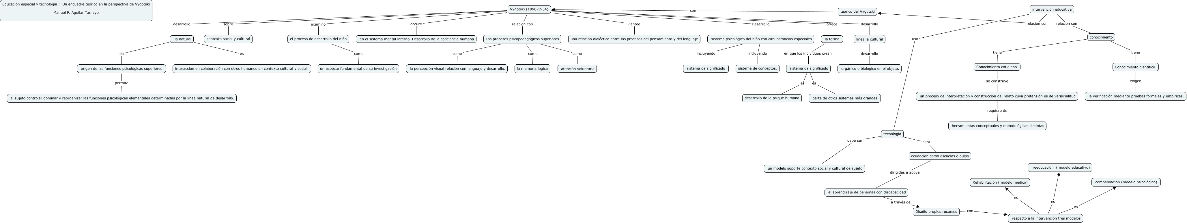 This Concept Map, created with IHMC CmapTools, has information related to: Educacion especial y tecnología, Vygotski (1896-1934) desarrollo línea la cultural, Vygotski (1896-1934) relacion con Los procesos psicopedagógicos superiores, intervención educativa uso tecnologia, respecto a la intervención tres modelos es Rehabilitación (modelo medico), Diseño propios recursos con respecto a la intervención tres modelos, Vygotski (1896-1934) Planteo una relación dialéctica entre los procesos del pensamiento y del lenguaje, sistema de significado es desarrollo de la psique humana, Conocimiento científico exigen la verificación mediante pruebas formales y empiricas., Los procesos psicopedagógicos superiores como la percepción visual relación con lenguaje y desarrollo., intervención educativa relacion con conocimiento, intervención educativa relacion con teorico del Vygotski, un proceso de interpretación y construcción del relato cuya pretensión es de verisimilitud requiere de herramientas conceptuales y metodológicas distintas, teorico del Vygotski con Vygotski (1896-1934), la natural da origen de las funciones psicológicas superiores, Vygotski (1896-1934) examino el proceso de desarrollo del niño, Vygotski (1896-1934) desarrollo la natural, Los procesos psicopedagógicos superiores como la memoria lógica, Conocimiento cotidiano se construye un proceso de interpretación y construcción del relato cuya pretensión es de verisimilitud, Vygotski (1896-1934) Desarrollo sistema psicológico del niño con circunstancias especiales, Los procesos psicopedagógicos superiores como atención voluntaria