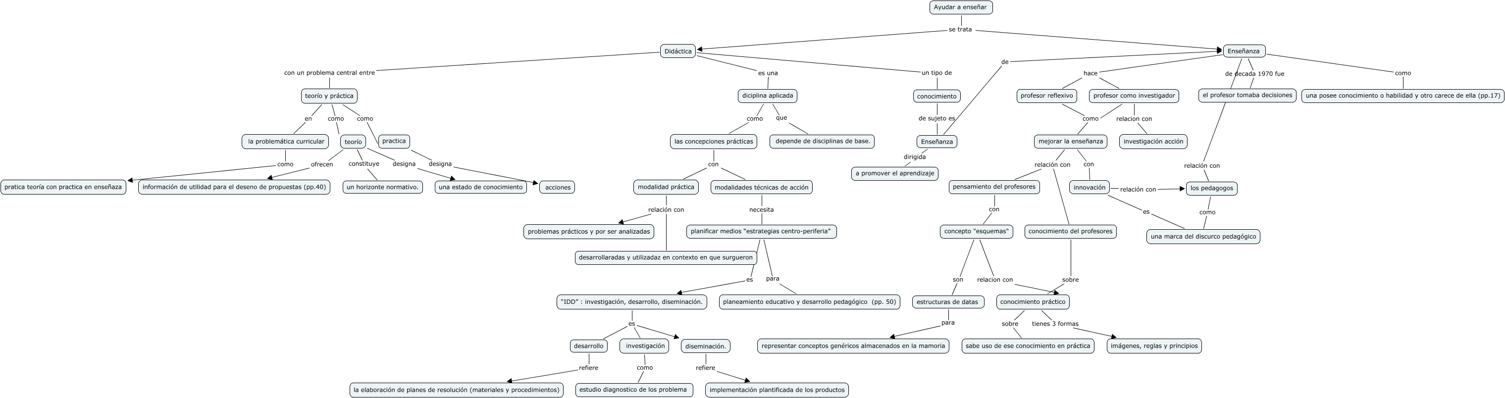 This Concept Map, created with IHMC CmapTools, has information related to: ayudar a ensenar(Daniel Feldman), mejorar la enseñanza relación con pensamiento del profesores, planificar medios “estrategias centro-periferia” para planeamiento educativo y desarrollo pedagógico (pp. 50), teorío y práctica en la problemática curricular, conocimiento de sujeto es Enseñanza, pensamiento del profesores con concepto "esquemas", Enseñanza relación con los pedagogos, “IDD” : investigación, desarrollo, diseminación. es investigación, teorío y práctica como practica, teorío constituye un horizonte normativo., modalidades técnicas de acción necesita planificar medios “estrategias centro-periferia”, Didáctica con un problema central entre teorío y práctica, planificar medios “estrategias centro-periferia” es “IDD” : investigación, desarrollo, diseminación., “IDD” : investigación, desarrollo, diseminación. es diseminación., las concepciones prácticas con modalidades técnicas de acción, mejorar la enseñanza con innovación, diseminación. refiere implementación plantificada de los productos, Didáctica es una diciplina aplicada, practica designa acciones, innovación es una marca del discurco pedagógico, Didáctica un tipo de conocimiento