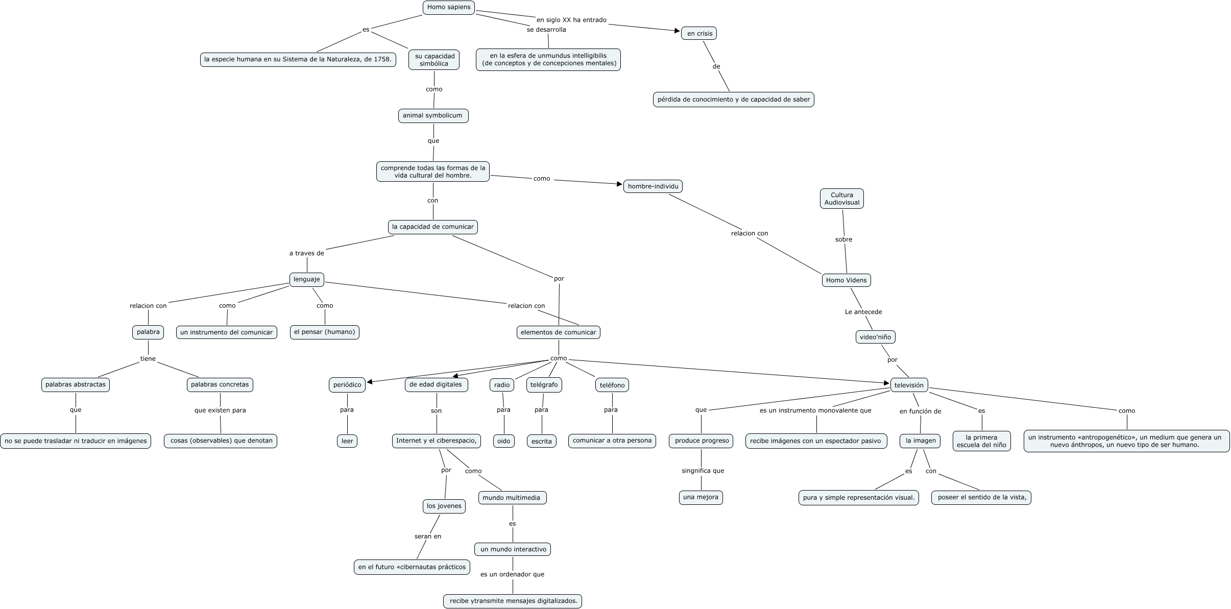 This Concept Map, created with IHMC CmapTools, has information related to: HOMO SAPIENS, mundo multimedia es un mundo interactivo, lenguaje relacion con elementos de comunicar, Homo sapiens en siglo XX ha entrado en crisis, Homo sapiens se desarrolla en la esfera de unmundus intelligibilis (de conceptos y de concepciones mentales), un mundo interactivo es un ordenador que recibe ytransmite mensajes digitalizados., comprende todas las formas de la vida cultural del hombre. como hombre-individu, televisión en función de la imagen, de edad digitales son Internet y el ciberespacio,, produce progreso singnifica que una mejora, Internet y el ciberespacio, por los jovenes, video'niño por televisión, elementos de comunicar como televisión, Homo Videns Le antecede video'niño, la capacidad de comunicar a traves de lenguaje, la imagen con poseer el sentido de la vista,, lenguaje como el pensar (humano), radio para oido, su capacidad simbólica como animal symbolicum, comprende todas las formas de la vida cultural del hombre. con la capacidad de comunicar, la capacidad de comunicar por elementos de comunicar
