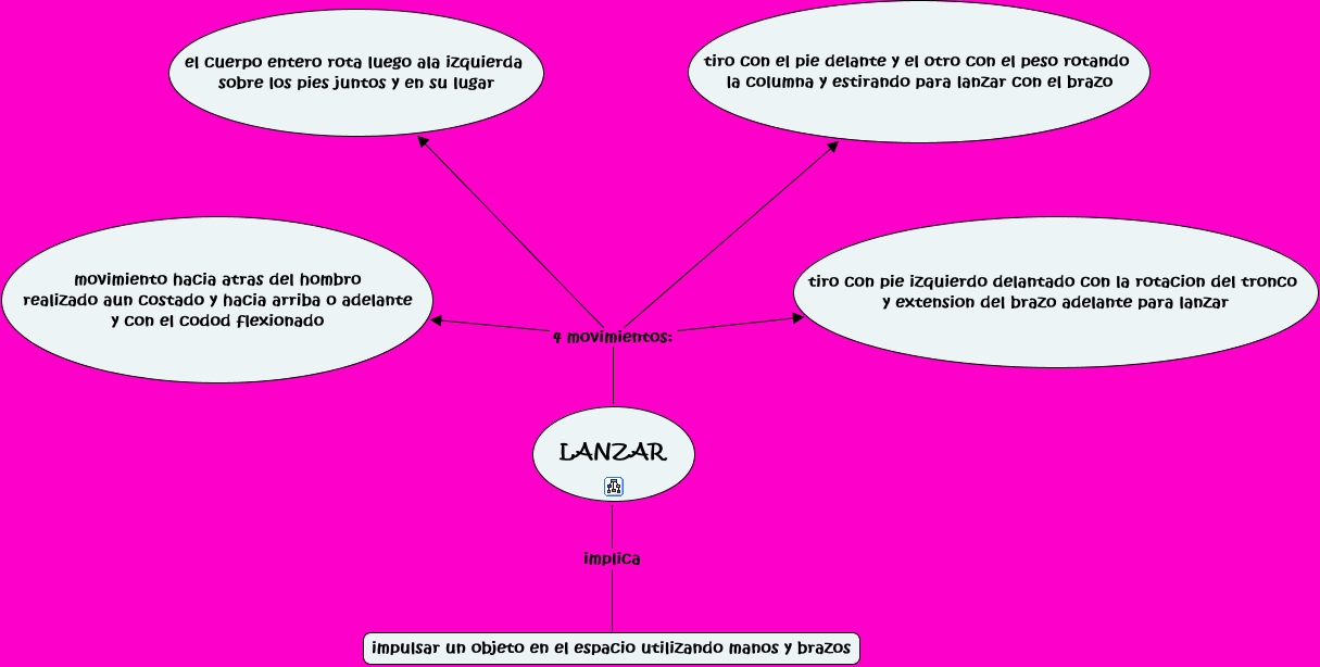Este Cmap, tiene información relacionada con: lanzar, LANZAR 4 movimientos: movimiento hacia atras del hombro realizado aun costado y hacia arriba o adelante y con el codod flexionado, LANZAR 4 movimientos: tiro con el pie delante y el otro con el peso rotando la columna y estirando para lanzar con el brazo, LANZAR implica impulsar un objeto en el espacio utilizando manos y brazos, LANZAR 4 movimientos: tiro con pie izquierdo delantado con la rotacion del tronco y extension del brazo adelante para lanzar, LANZAR 4 movimientos: el cuerpo entero rota luego ala izquierda sobre los pies juntos y en su lugar