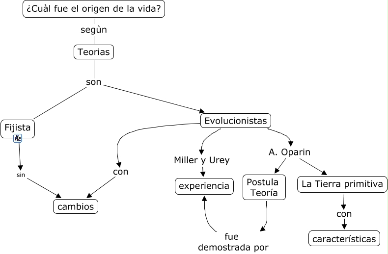 Este Cmap, tiene información relacionada con: 7ª el origen de la vida, Evolucionistas Miller y Urey experiencia, Evolucionistas A. Oparin La Tierra primitiva, La Tierra primitiva con características, ¿Cuàl fue el origen de la vida? segùn Teorias, Postula Teoría fue demostrada por experiencia, Teorias son Fijista, Fijista sin cambios, Evolucionistas A. Oparin Postula Teoría, Teorias son Evolucionistas, Evolucionistas con cambios