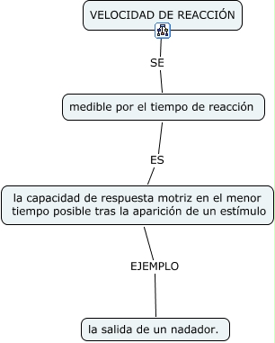 Este Cmap, tiene información relacionada con: Velocidad de reaccion, medible por el tiempo de reacción ES la capacidad de respuesta motriz en el menor tiempo posible tras la aparición de un estímulo, VELOCIDAD DE REACCIÓN SE medible por el tiempo de reacción, la capacidad de respuesta motriz en el menor tiempo posible tras la aparición de un estímulo EJEMPLO la salida de un nadador.