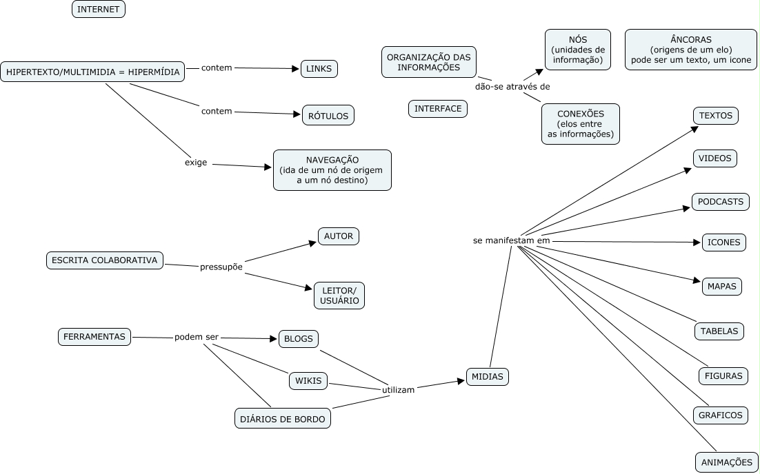 Esse mapa conceitual, produzido no IHMC CmapTools, tem a informação relacionada a: mapa_hiperdocumento_primeira_versao.cmap, ESCRITA COLABORATIVA pressupõe LEITOR/ USUÁRIO, DIÁRIOS DE BORDO utilizam MIDIAS, MIDIAS se manifestam em GRAFICOS, FERRAMENTAS podem ser WIKIS, FERRAMENTAS podem ser BLOGS, MIDIAS se manifestam em TABELAS, ESCRITA COLABORATIVA pressupõe AUTOR, MIDIAS se manifestam em ANIMAÇÕES, ORGANIZAÇÃO DAS INFORMAÇÕES dão-se através de CONEXÕES (elos entre as informações), HIPERTEXTO/MULTIMIDIA = HIPERMÍDIA contem LINKS, MIDIAS se manifestam em FIGURAS, MIDIAS se manifestam em VIDEOS, ORGANIZAÇÃO DAS INFORMAÇÕES dão-se através de NÓS (unidades de informação), MIDIAS se manifestam em PODCASTS, FERRAMENTAS podem ser DIÁRIOS DE BORDO, MIDIAS se manifestam em MAPAS, MIDIAS se manifestam em TEXTOS, HIPERTEXTO/MULTIMIDIA = HIPERMÍDIA contem RÓTULOS, HIPERTEXTO/MULTIMIDIA = HIPERMÍDIA exige NAVEGAÇÃO (ida de um nó de origem a um nó destino), MIDIAS se manifestam em ICONES